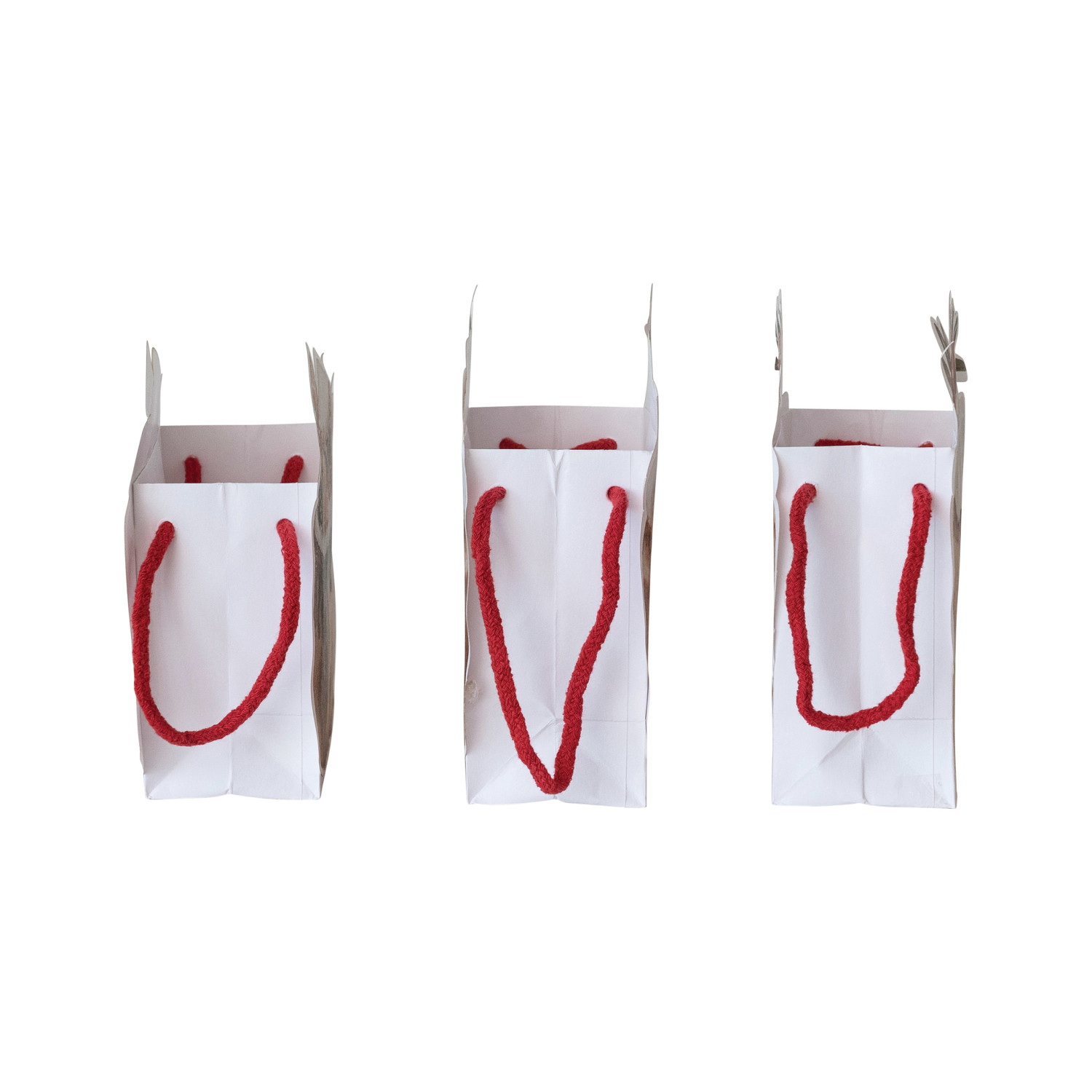 This printed paper cake shaped gift bag set is a sweet and adorable way to wrap gifts. The gift bag features a delicious and festive cake design with frostings in 3 styles each with a matching cotton handle. The gift bag is made of paper and cotton that are eco-friendly and sturdy, and can be reused or recycled easily. The gift bag measures 6.25 inches in length, 2.5 inches in width, and 6.25 inches in height, and comes in a set of 3. Use it for birthdays, anniversaries, or graduations, as this gift bag will add some fun and flavor to gifts. A sweet and adorable printed paper gift bag with cake shape and cotton handle. A lovely choice for wrapping gifts, as it features a delicious and festive cake design in three styles. Ideal for any celebration, such as birthdays, anniversaries, or graduations, as it adds some fun and flavor to presents.