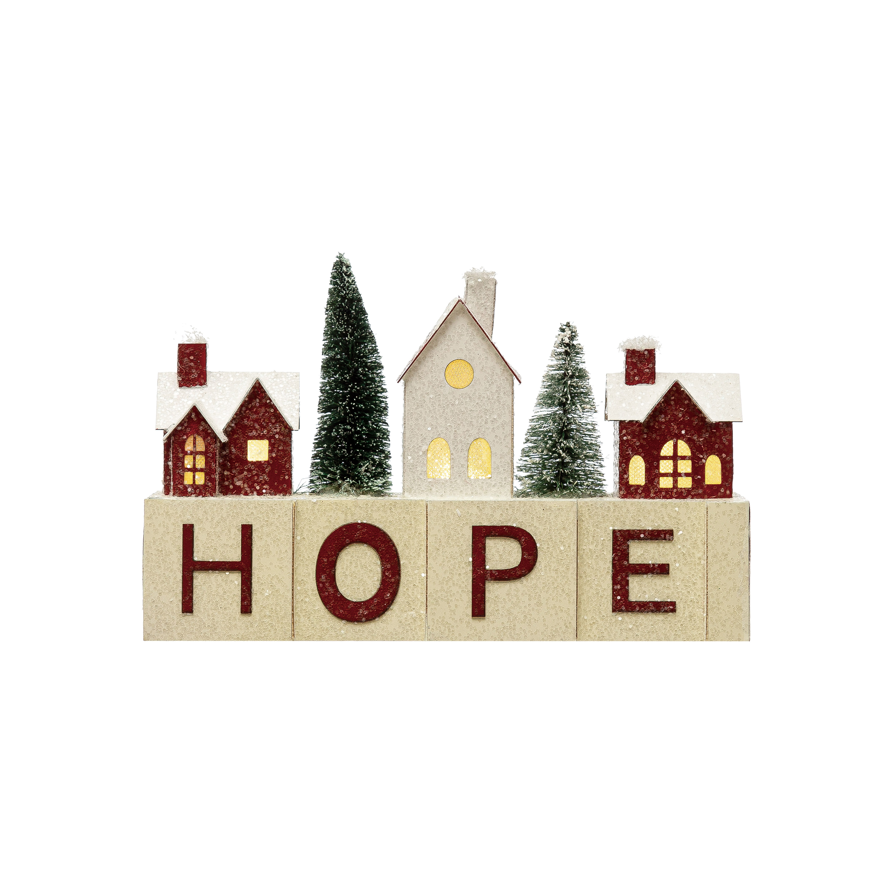 Catalog Name: 8-1/2"L x 2-1/4"W x 5-3/4"H Paper Village with LED Lights and Bottle Brush Trees "Hope", Multi Color (Batteries Included)