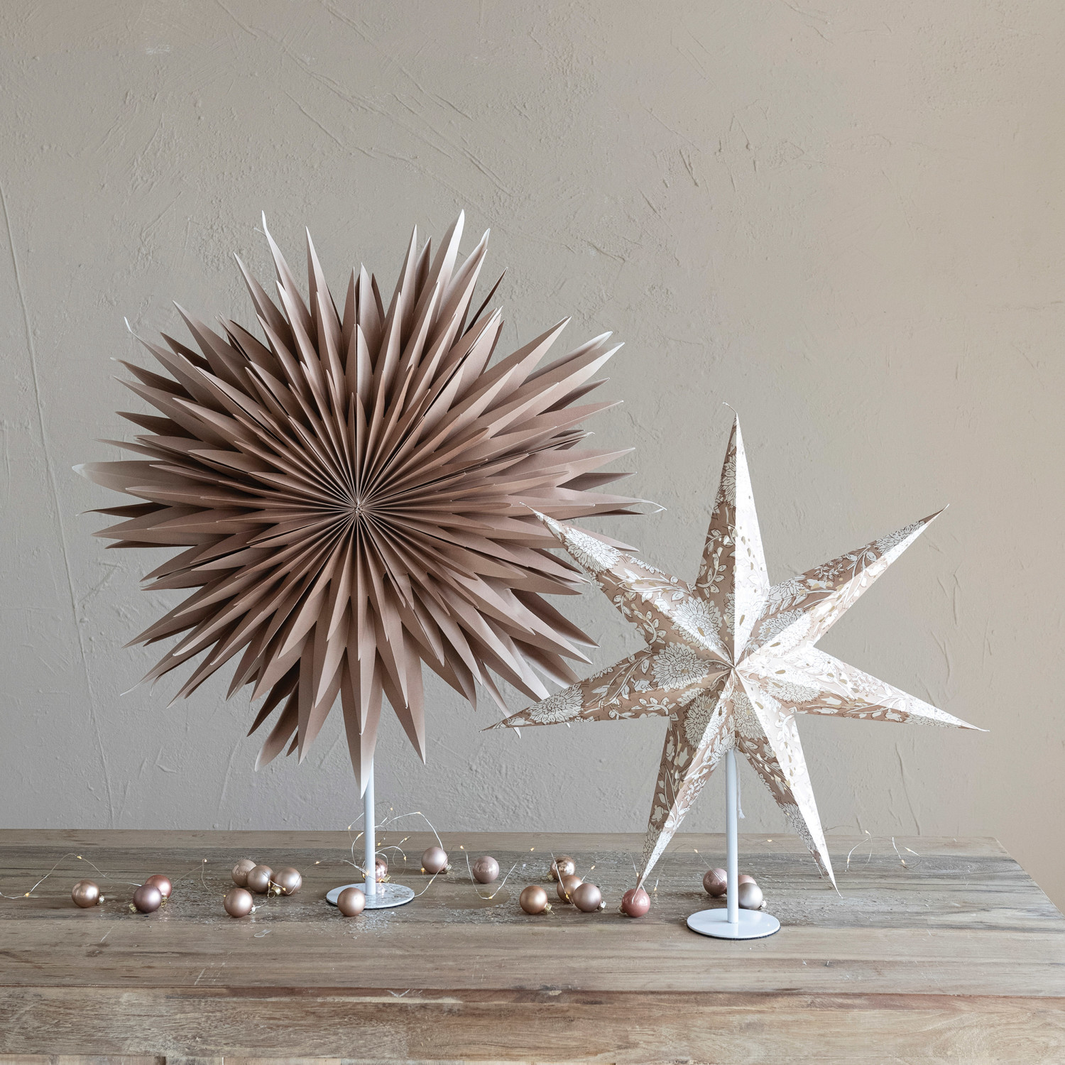 Catalog Name: 30"L x 7"W x 35"H Recycled Paper Folding Star w/ LED Light String & White Metal Stand, Brown (Requires 3-AA Batteries)