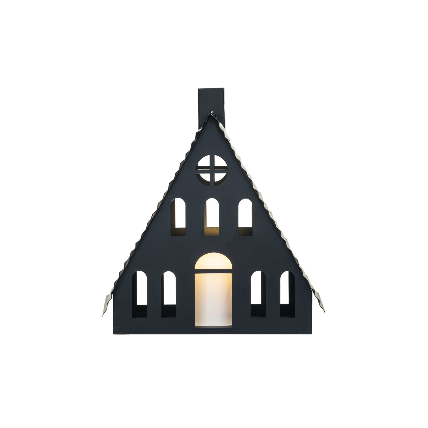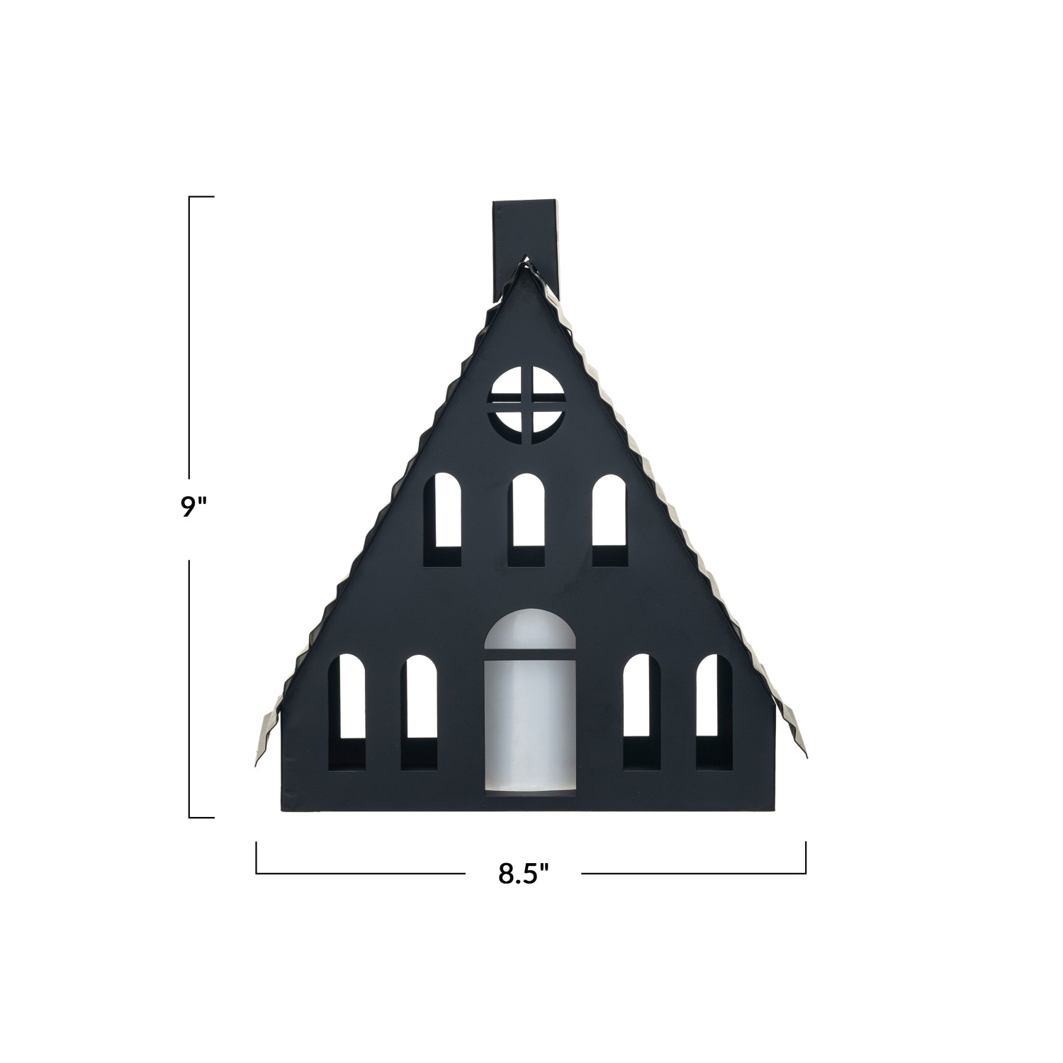 Catalog Name: 8-1/2"L x 4"W x 9"H Metal House w/ LED Candle, Black (Requires 2-AA Batteries)