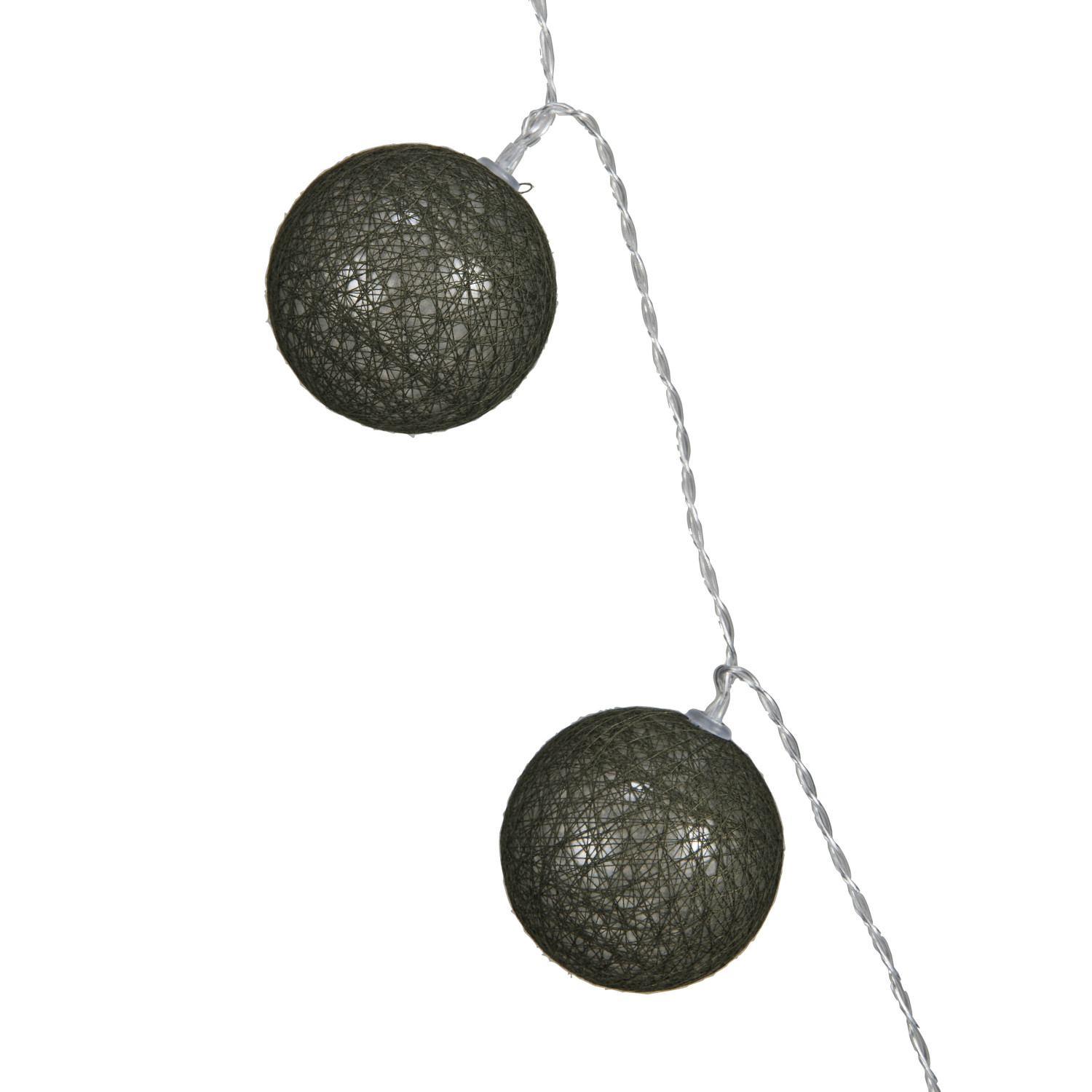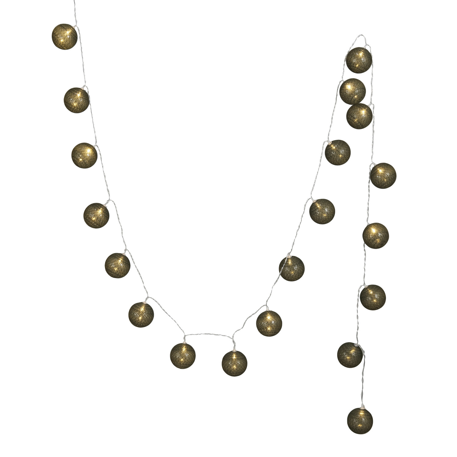 This set of fabric string ball lights with a plastic cord and 20 lights in green is a colorful and fun piece that will brighten up any space. The string lights' various colors create a joyful and happy ambiance. Fabric string balls give texture and flair to the string lights, producing a magnificent and distinctive display. 20 LED lights give shine to the string lights, making them stunning. A battery-operated construction makes the string lights easy to hang and move, making any display straightforward. The string lights are made of polycarbonate, polyester, and LED light, with a soft and flexible quality. They are easy to clean and maintain. The string lights measure 118 inches in length and 2.25 inches in height. This is a versatile and stylish piece that can be displayed in the bedroom, living room, or party. It is a playful piece to add some light and whimsy to the space. A colorful and fun set of fabric string ball lights with plastic cord and 20 lights in green. A playful piece to add some light and whimsy to the bedroom, living room, or party. Requires 2-pcs AA batteries.