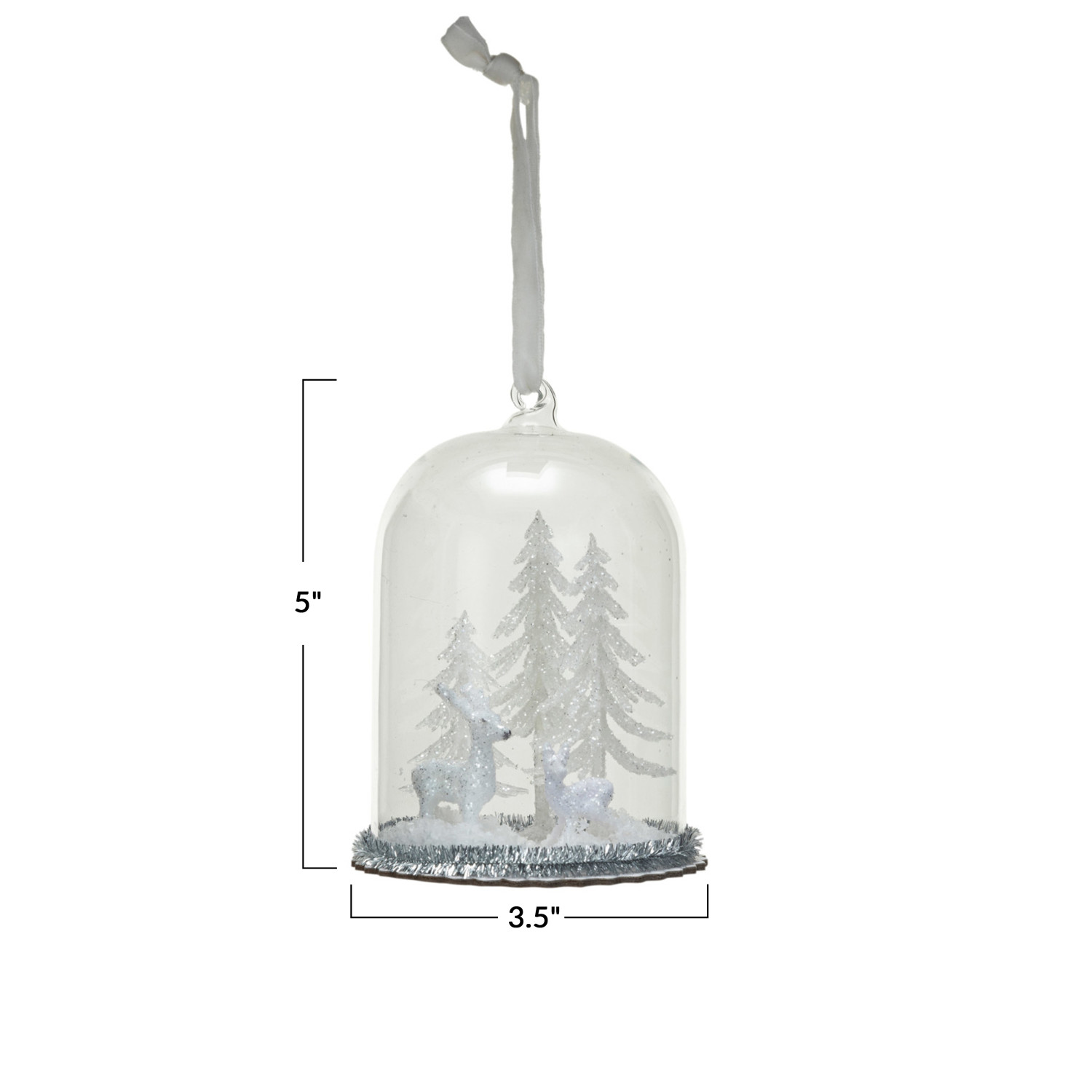 Catalog Name: 3-1/2" Round x 5"H Glass Cloche w/ Deer & Trees Ornament, White & Silver Finish