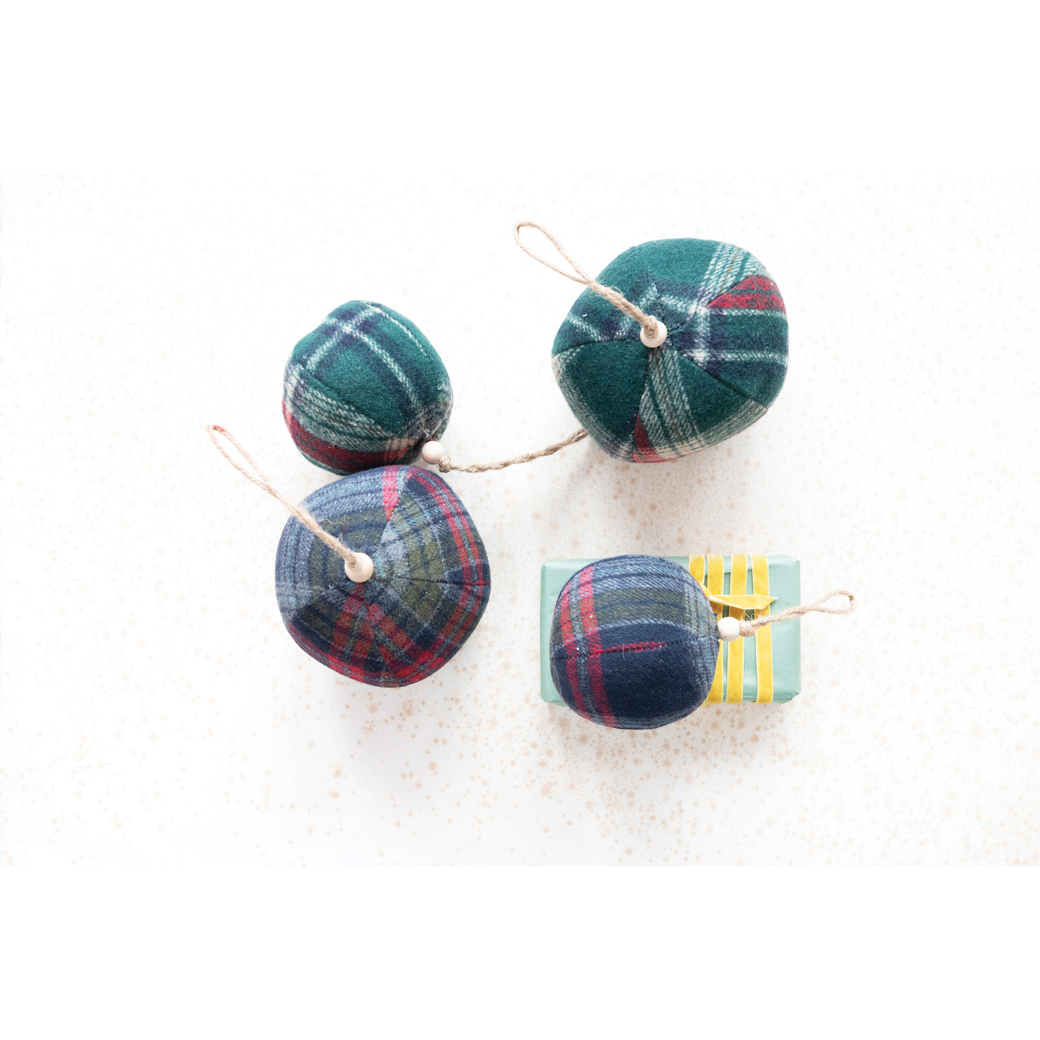 4" Round Fabric Flannel Ball Ornament with Wood Bead, Multi Color Plaid, 2 Styles