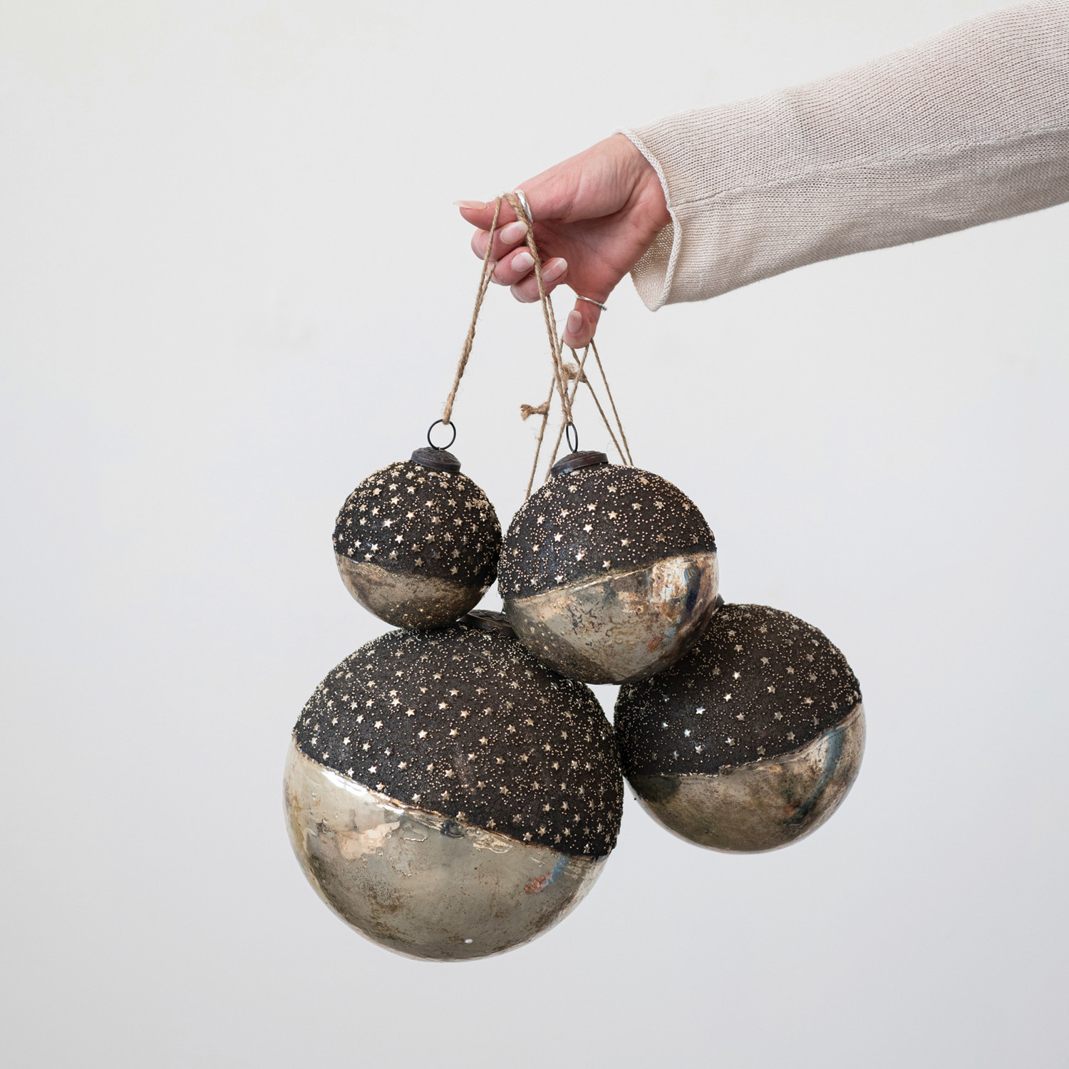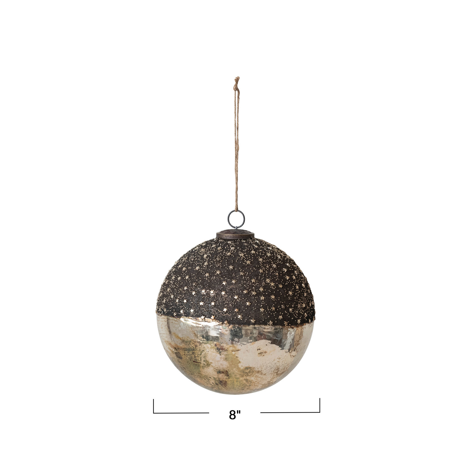 Catalog Name: 8" Round Mercury Glass Ball Ornament w/ Stars, Dipped Bronze & Silver Finish