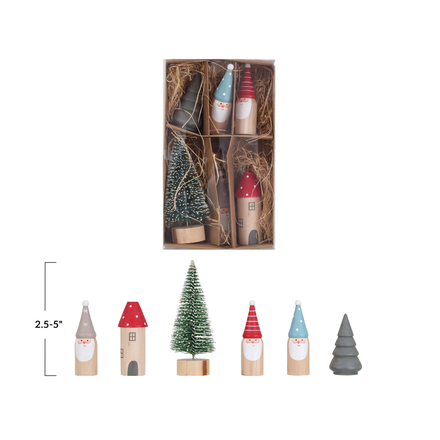 Catalog Name: 2-1/2"H - 5"H Wood & Sisal House, Trees & Gnomes, Multi Color, Boxed Set of 6