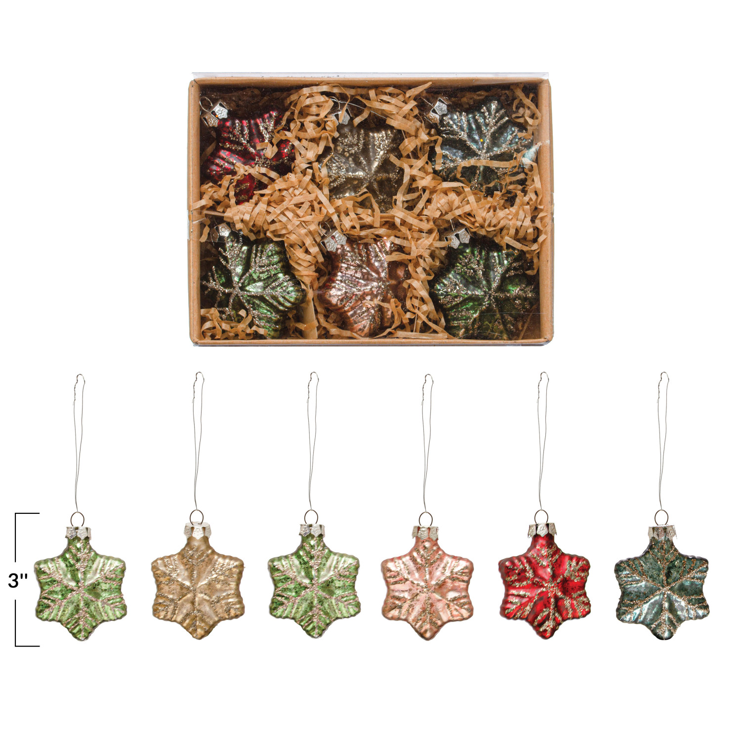 Catalog Name: 3"H Mercury Glass Snowflake Ornaments w/ Glitter, Multi Color, Boxed Set of 6