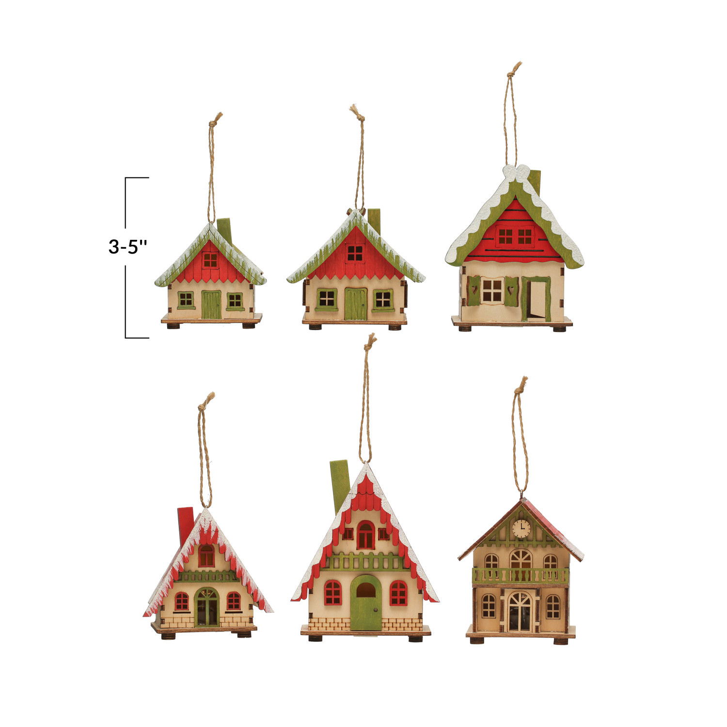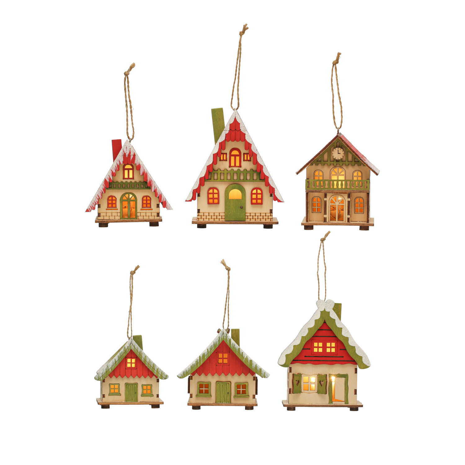 Catalog Name: 3"H - 5"H Wood Laser Cut House Ornament w/ Snow & LED Light, Red & Green, 6 Styles (Batteries Included)