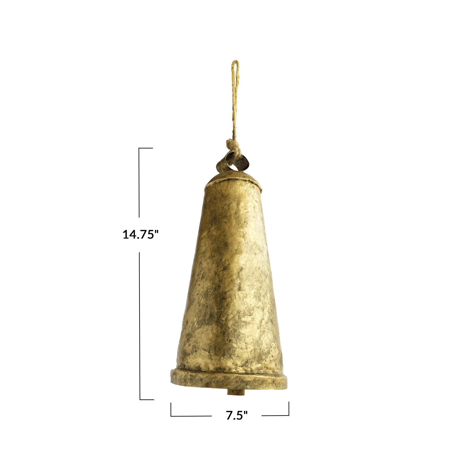 This classic and elegant ornament adds a touch of vintage charm to any holiday décor or year-round home accent. Featuring a beautiful 7.5-inch-diameter antique gold metal bell suspended from a rustic jute rope hanger, this ornament creates a timeless and sophisticated look. Measuring 14.75 inches in height, it's ideal for hanging on Christmas trees, doorknobs, mantels, or anywhere a touch of rustic elegance is desired. The sturdy metal construction with a rich antique gold finish ensures long-lasting beauty, while the natural jute rope hanger adds a touch of natural texture. This is a perfect choice for anyone who loves graceful and elegant home decor. A classic and elegant ornament featuring a beautiful 7.5-inch diameter antique gold metal bell suspended from a rustic jute rope hanger. Adds a touch of vintage charm to any holiday décor or year-round home accents. Ideal for hanging on Christmas trees, doorknobs, mantels, or anywhere a touch of rustic elegance is desired.