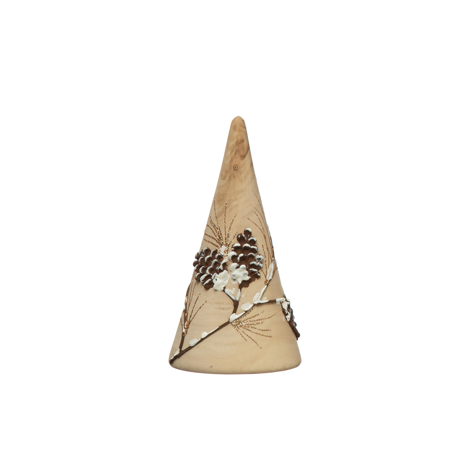 Catalog Name: 3-1/2" Round x 6-1/4"H Hand-Painted Eucalyptus Wood Tree with Pinecone, Snow and Glitter, Multi Color