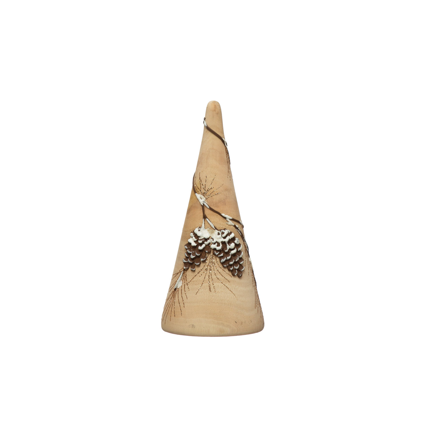 Catalog Name: 3-1/2" Round x 8-1/2"H Hand-Painted Eucalyptus Wood Tree with Pinecone, Snow and Glitter, Multi Color