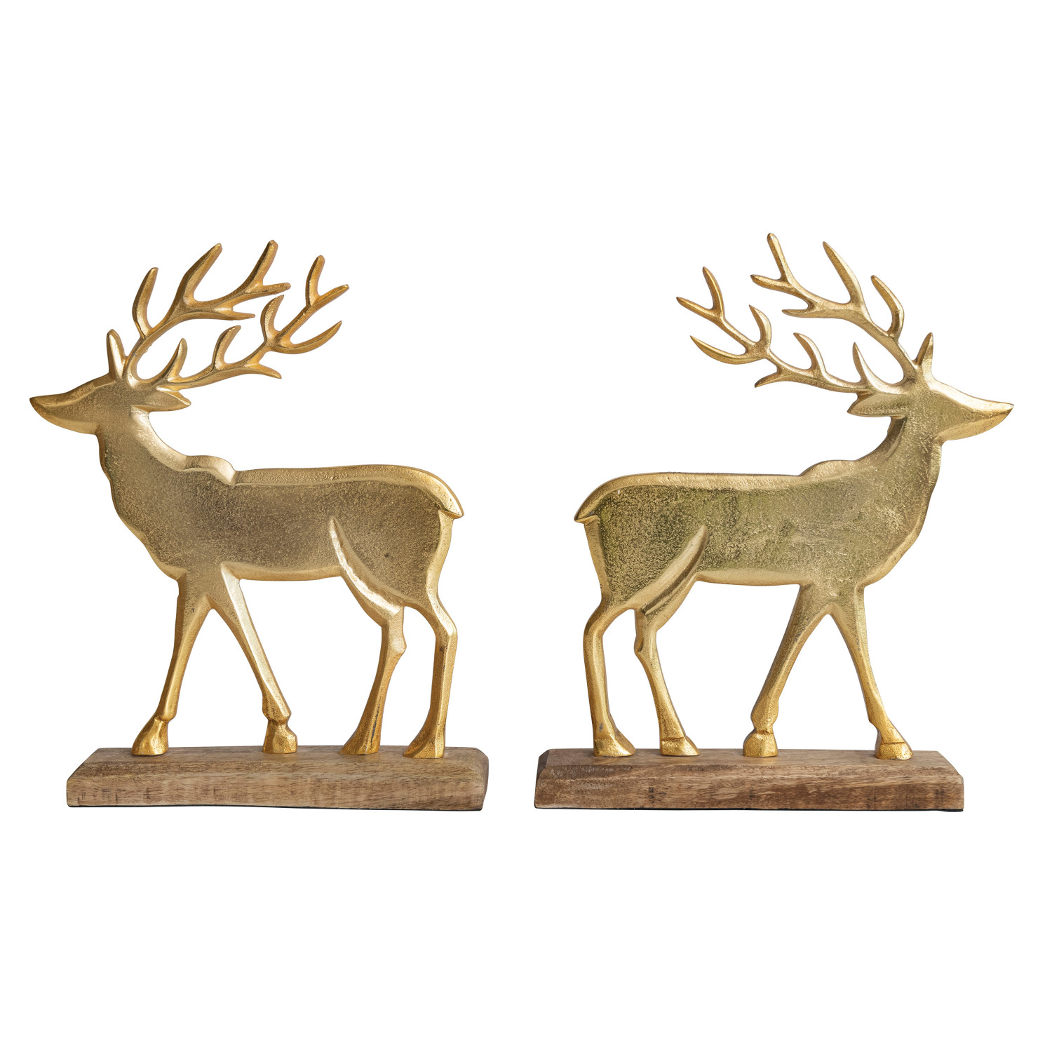 Catalog Name: 9"L x 2"W x 12-1/4"H Cast Aluminum Deer on Mango Wood Bases, Gold Finish & Natural, Set of 2