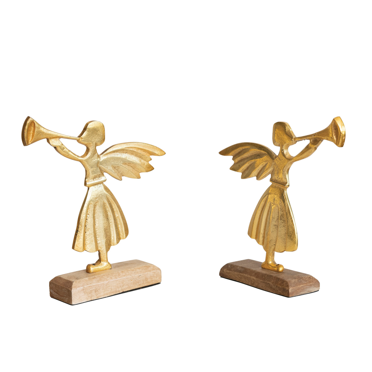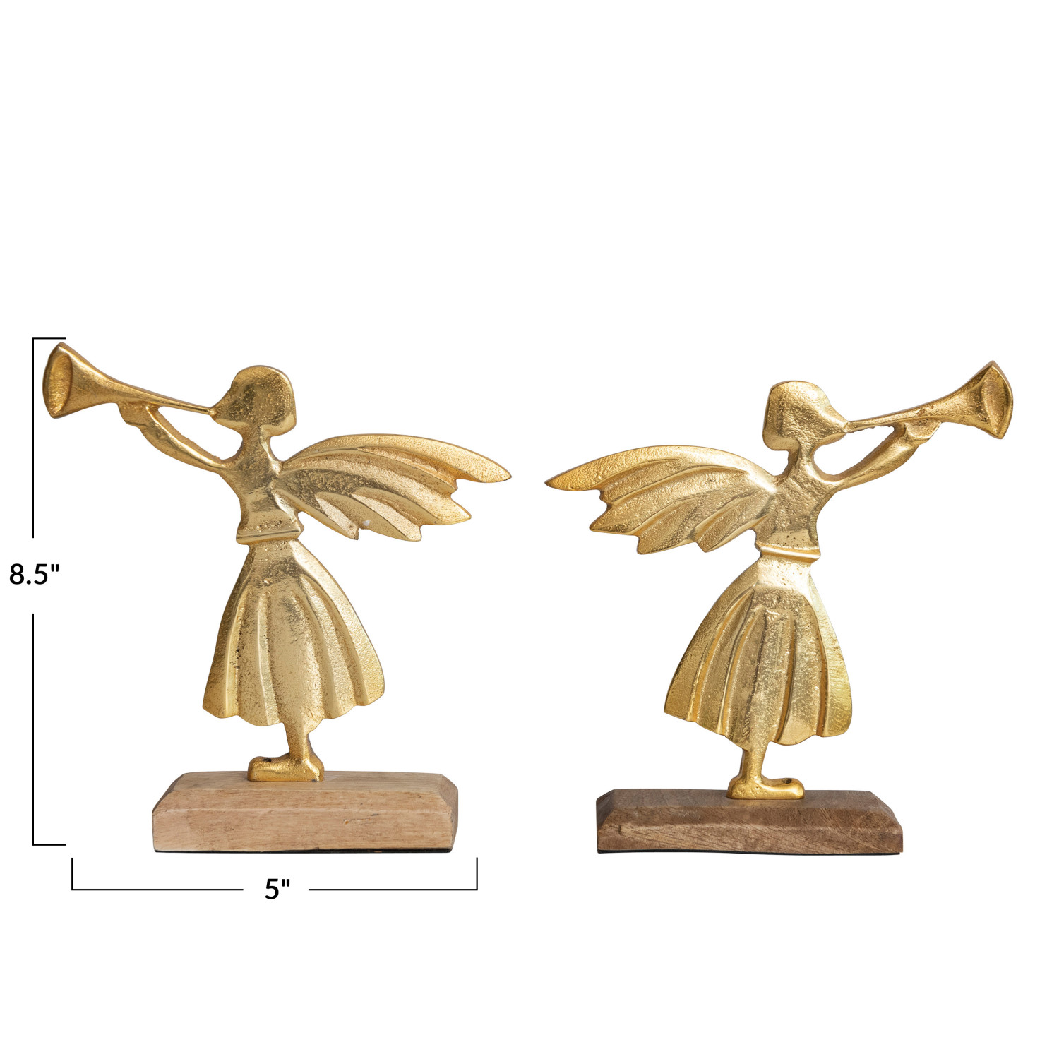 Catalog Name: 5"L x 2"W x 8-1/2"H Cast Aluminum Angels on Mango Wood Bases, Gold Finish & Natural, Set of 2