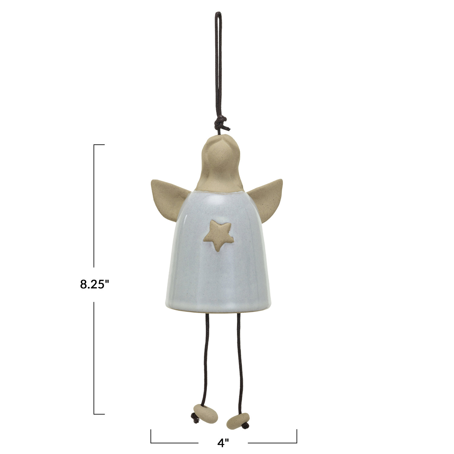 Catalog Name: 4"L x 3"W x 8-1/4"H Stoneware Angel Bell w/ Star & Cotton Rope Hanger, Reactive Glaze, White (Each One Will Vary)