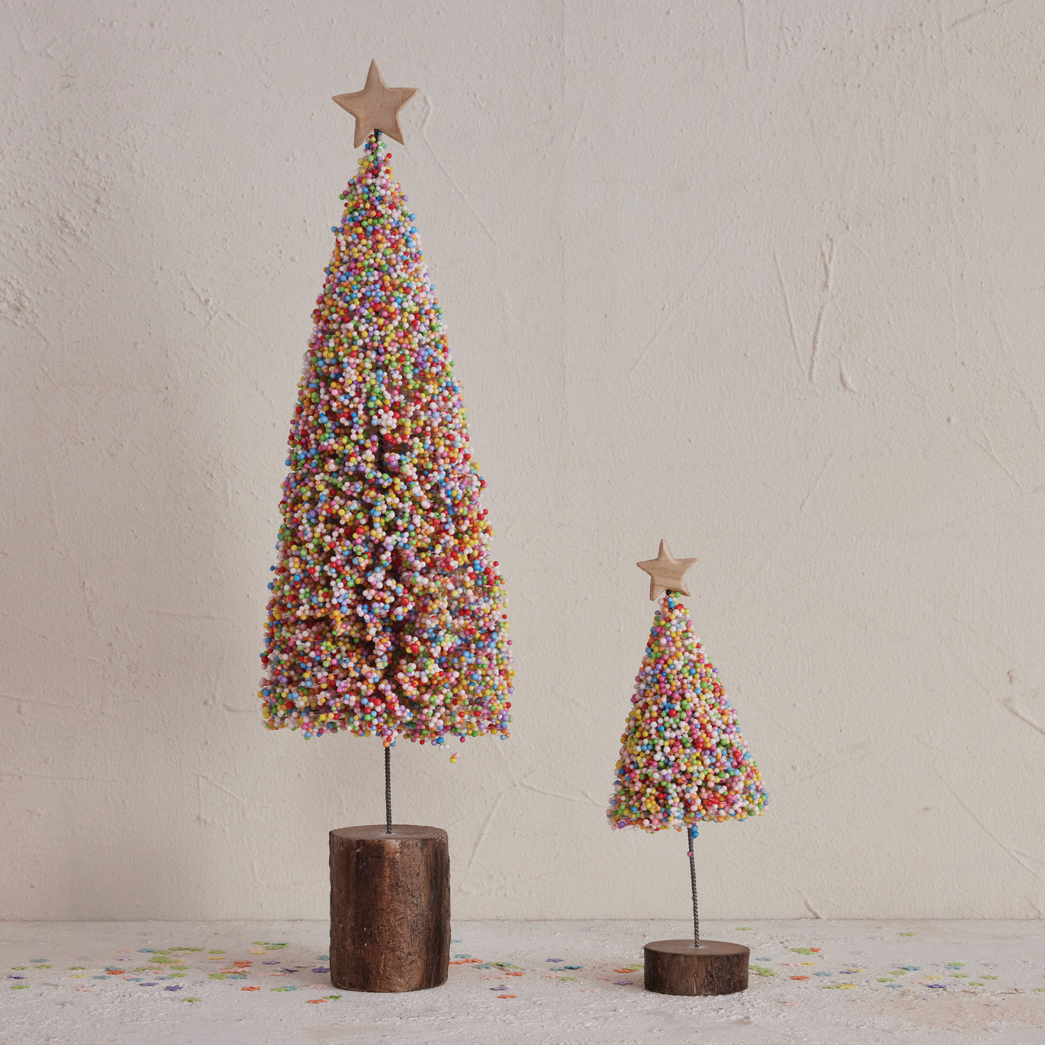 Catalog Name: 3" Round x 9"H Foam Confetti Beads & Resin Christmas Tree w/ Wood Slice Base & Star, Multi Color