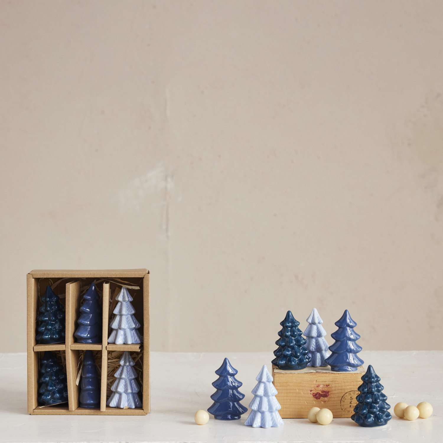 2-1/2"H Stoneware Trees, Blue, Boxed Set of 6