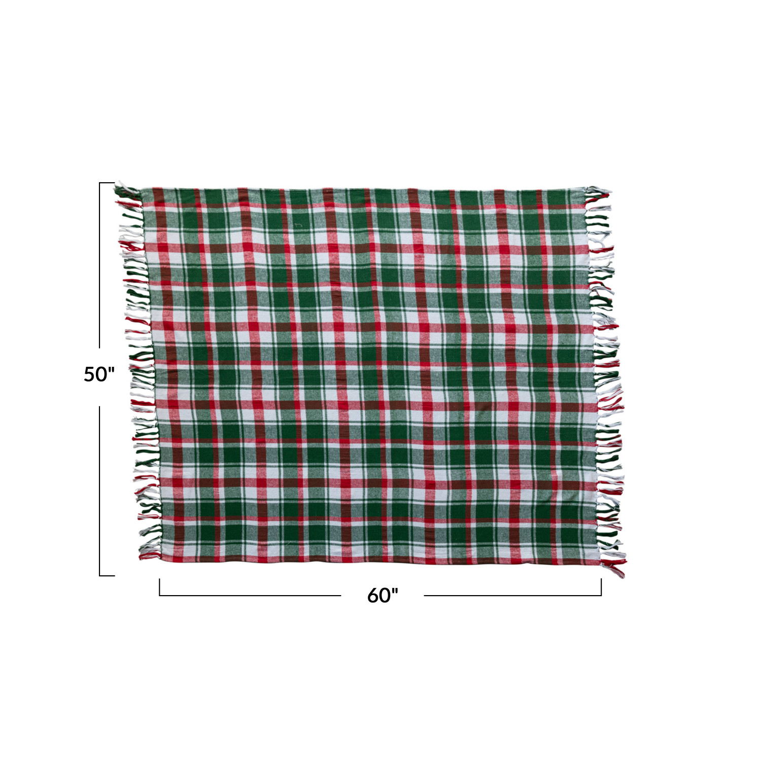 Catalog Name: 60"L x 50"W Brushed Cotton Flannel Throw w/ Fringe, Red, Green & White Plaid