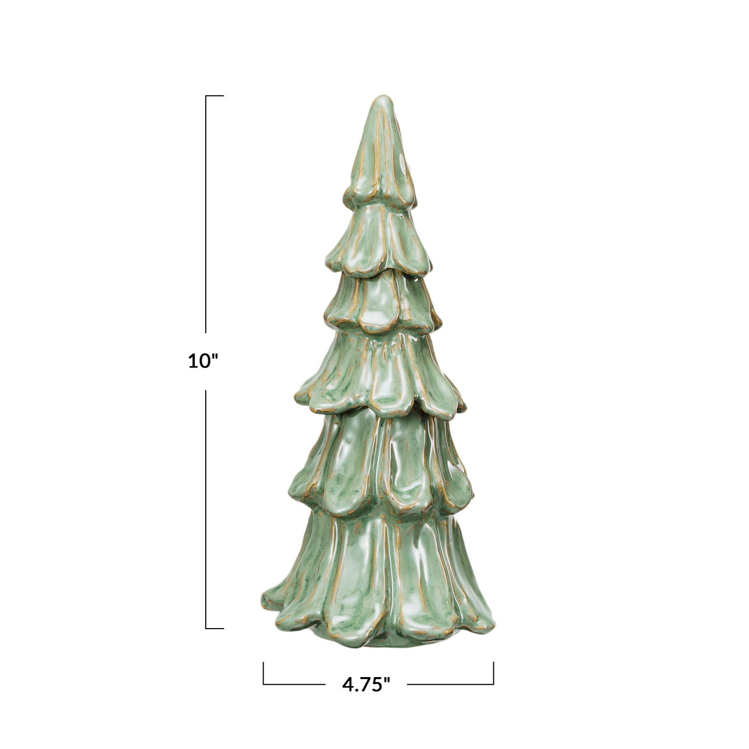 This green handmade stoneware tree is a lovely and unique way to decorate for the holidays. It features a handmade stoneware tree that has a reactive glaze and a green color, creating a stunning and eye-catching effect. The tree has a natural and elegant look that can suit any style and theme, from traditional to modern. The tree is ideal for displaying on a table, mantel, shelf, or window sill, where it can add a touch of charm and warmth to the space. The tree can also stand on its own or be paired with other trees or ornaments, making it a versatile and customizable option. The tree is made of stoneware that is durable, smooth, and easy to clean, making it a convenient and reusable option. It measures 4.75 inches in diameter and 10 inches in height, making it a graceful and noticeable centerpiece. Elevate the holiday decor with this eye-catching Christmas tree, adding both style and a touch of whimsy. An organic and unique handmade stoneware tree that has a reactive glaze and a green color. A natural and elegant addition to any holiday decor, this tree brings a touch of sophistication and style to any room. Ideal for displaying on a table, mantel, shelf, or window sill, this tree can stand on its own or be paired with other trees or ornaments.
