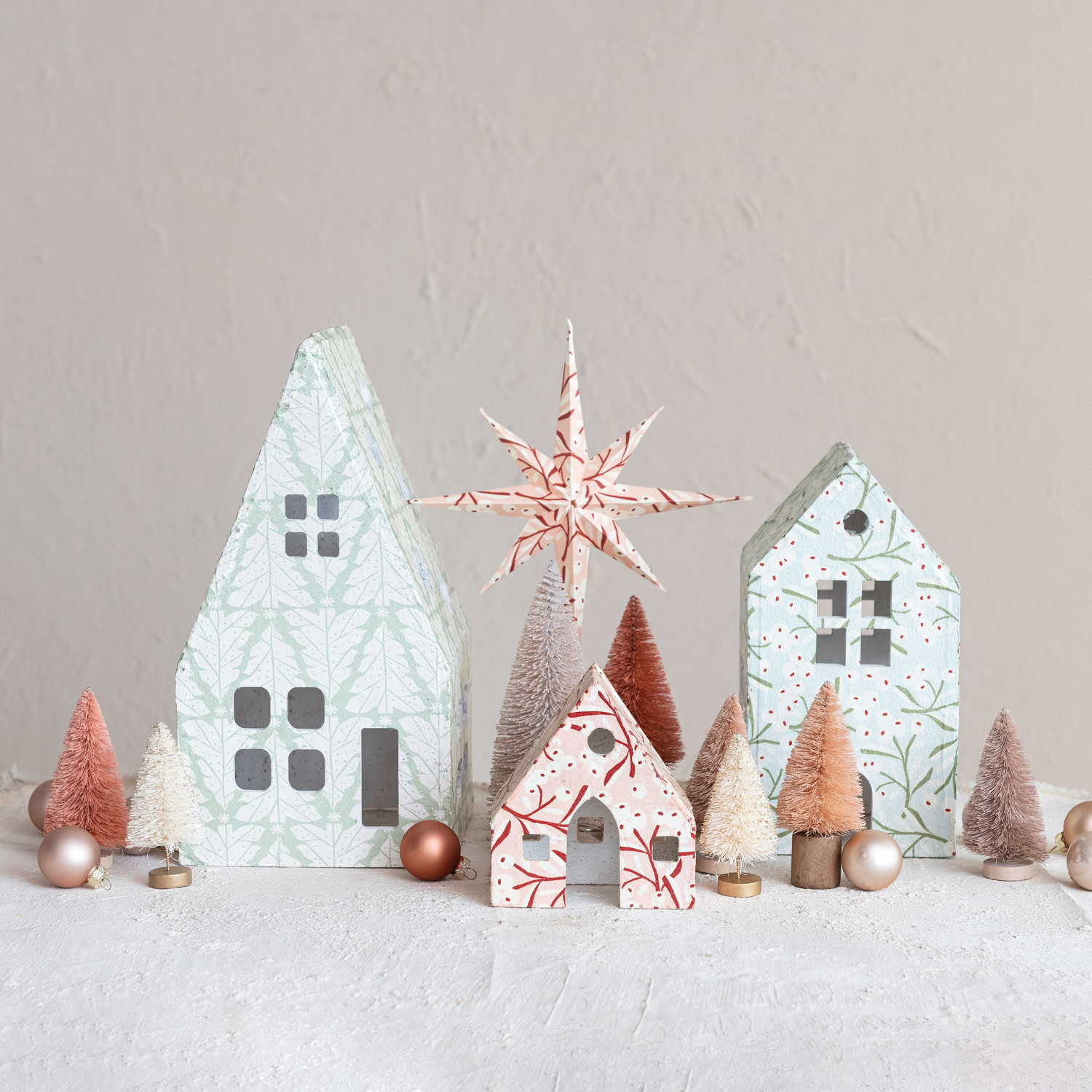 This set of printed paper mache houses is a beautiful and convenient way to decorate the home. It features a set of three printed paper mache houses with berry and tree patterns that give them a festive and cozy look, making them look like real houses. The houses have a textured and colorful surface that is pleasant to touch and look at. The houses are a cheerful and colorful piece that can create a holiday scene in any style, from country to Scandinavian. It is ideal for adding some warmth and personality to the home, where it can make any space feel more homey and inviting. The houses are made of cotton, which is soft, lightweight, and easy to move. This set of printed paper mache houses is a perfect choice for anyone who loves festive and cozy home decor. A set of three printed paper mache houses with berry and tree patterns that gives them a festive and cozy look. A cheerful and colorful piece that can create a holiday scene in any style, from country to Scandinavian. Ideal for adding some warmth and personality to the home, these houses can be displayed on a shelf, a mantel, or a windowsill.
