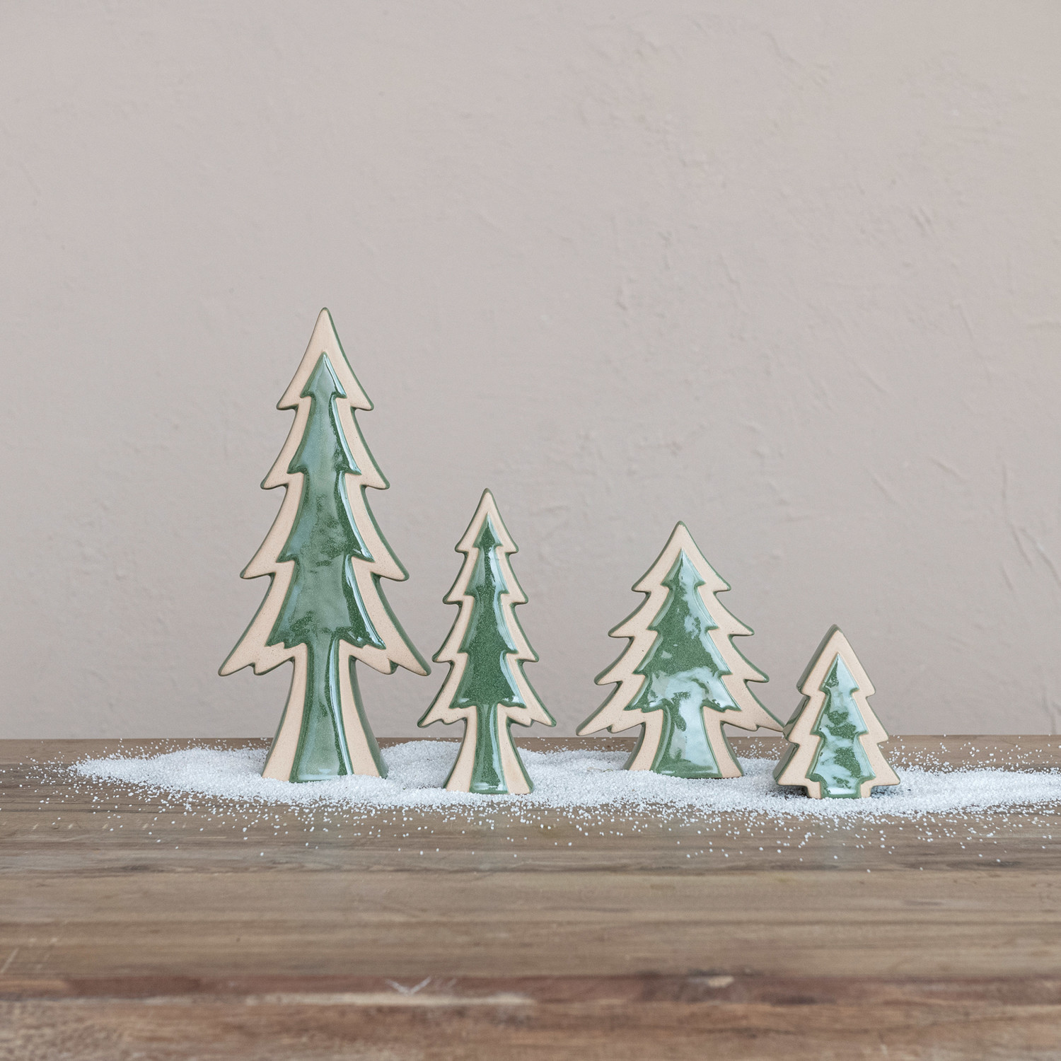 This green unglazed stoneware tree decor with reactive glaze is a beautiful and convenient way to decorate for the holidays. It features a sleek and simple stoneware tree decor with a reactive glaze that creates a unique pattern on each piece, making it a one-of-a-kind item. The tree decor has a green color that blends well with any space and style, adding a touch of sophistication and charm to the decor. The tree decor is ideal for displaying on a table, shelf, or mantel, where it can be used as a standalone piece or paired with other items. The tree decor is made of stoneware that is sturdy, durable, and easy to clean, making it a great choice for holiday decoration. It measures 3.75 inches in width and 8.25 inches in height, making it a subtle and attractive centerpiece. Elevate the holiday decor with this eye-catching Christmas tree, adding both style and a touch of whimsy. A sleek and simple stoneware tree decor with a reactive glaze that creates a unique pattern on each piece. A versatile and elegant addition to the holiday decor, this tree decor suits any space and style. Ideal for displaying on a table, shelf, or mantel, this tree decor can be used as a standalone piece or paired with other items.