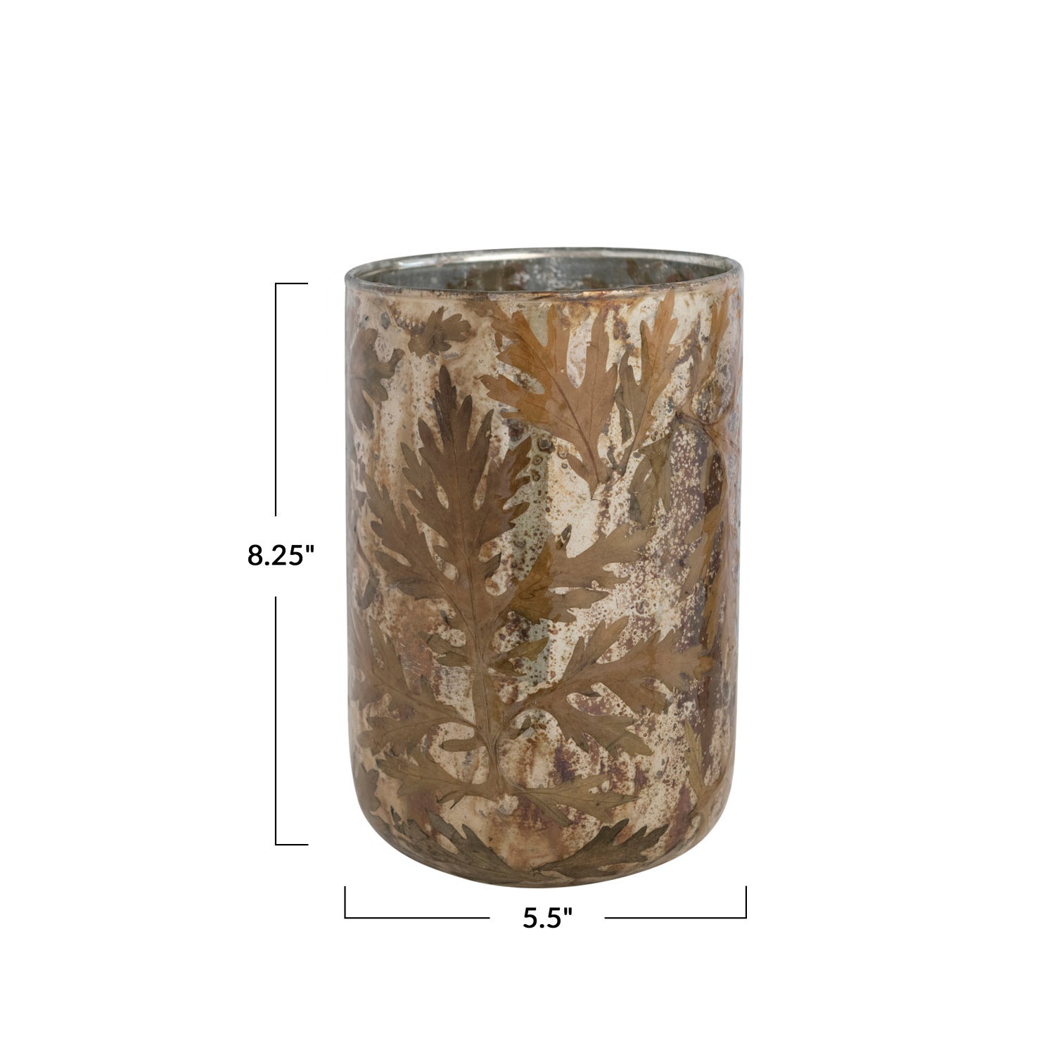 Mercury Glass Hurricane/Vase w/ Embedded Natural Oak Leaves, Antique Gold Finish
