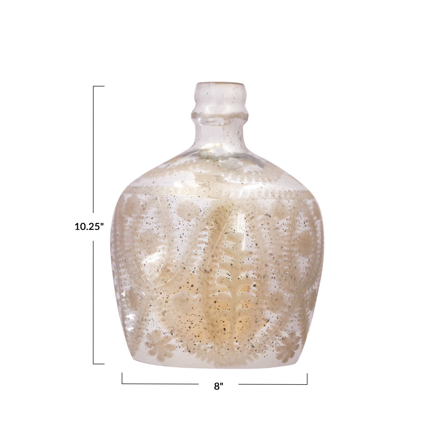 This elegant antique silver mercury glass vase is a fusion of classic design and contemporary elegance. The intricate etching and shimmering silver finish catch the light, creating a captivating glow that enhances any floral arrangement. Its generous size makes it an ideal choice for larger blooms, adding a touch of grandeur to the decor. It measures 8 inches in diameter and 10.25 inches in height. The vase's timeless appeal ensures it will be cherished as a focal point in the home for years to come. With its robust construction, this piece is not only visually appealing but also practical for everyday use. An exquisite etched mercury glass vase with an antique silver finish that exudes sophistication. This vase is a statement piece, seamlessly blending with both modern and traditional decors. Perfect for centerpieces, mantel displays, or as a chic standalone decorative item.