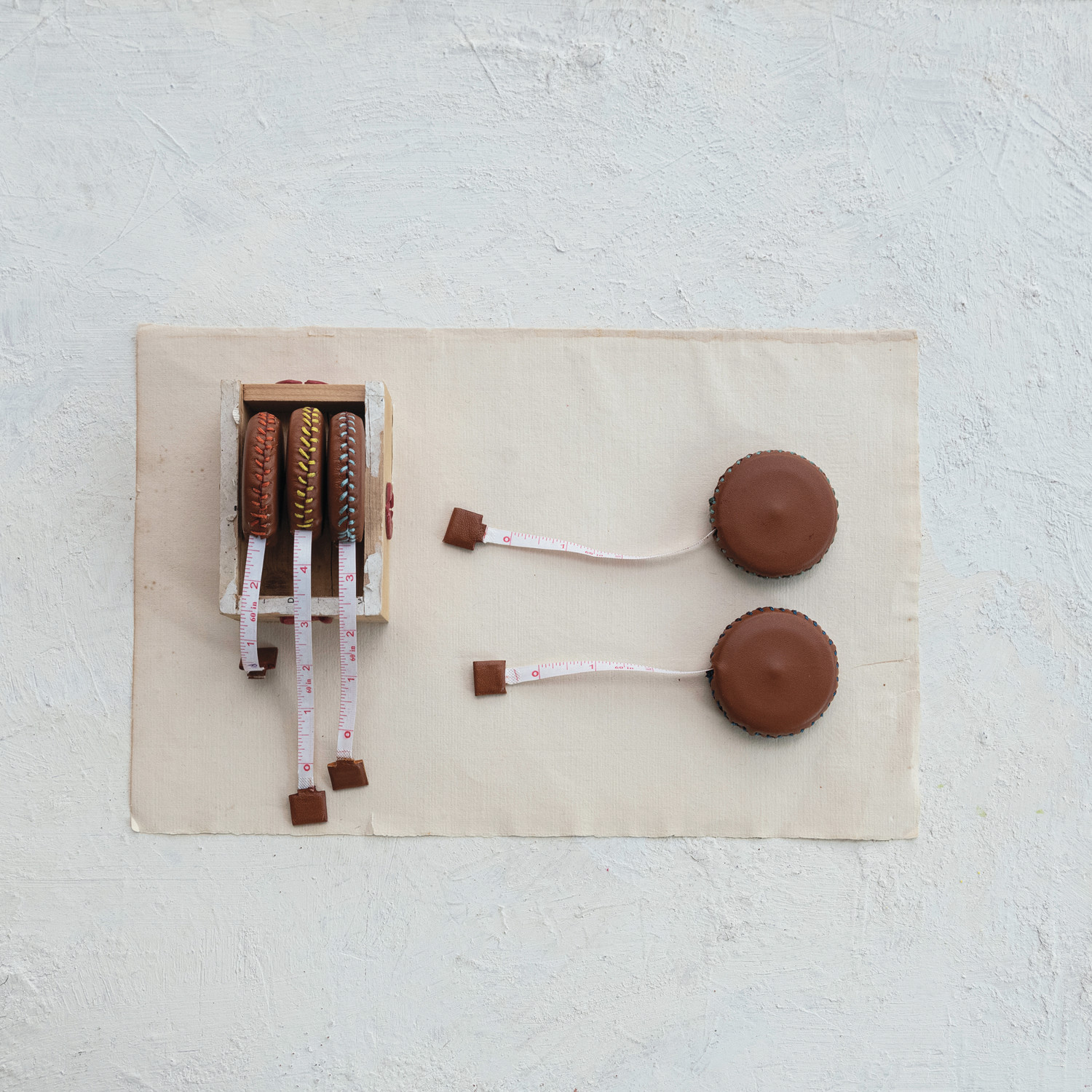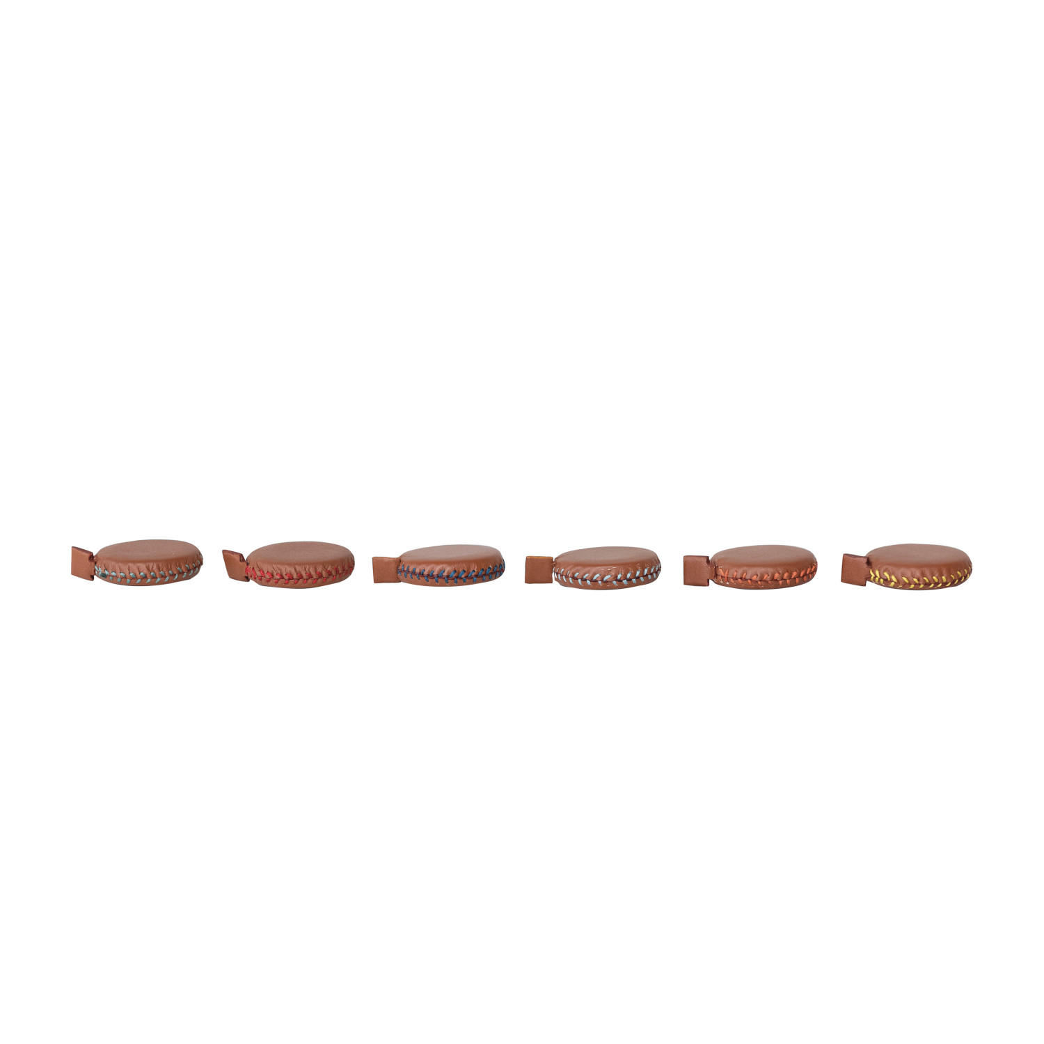 Catalog Name: 2" Round Handmade Leather Tape Measure w/ Blanket Stitch Edge, 6 Colors (Each Measures 5 Feet)