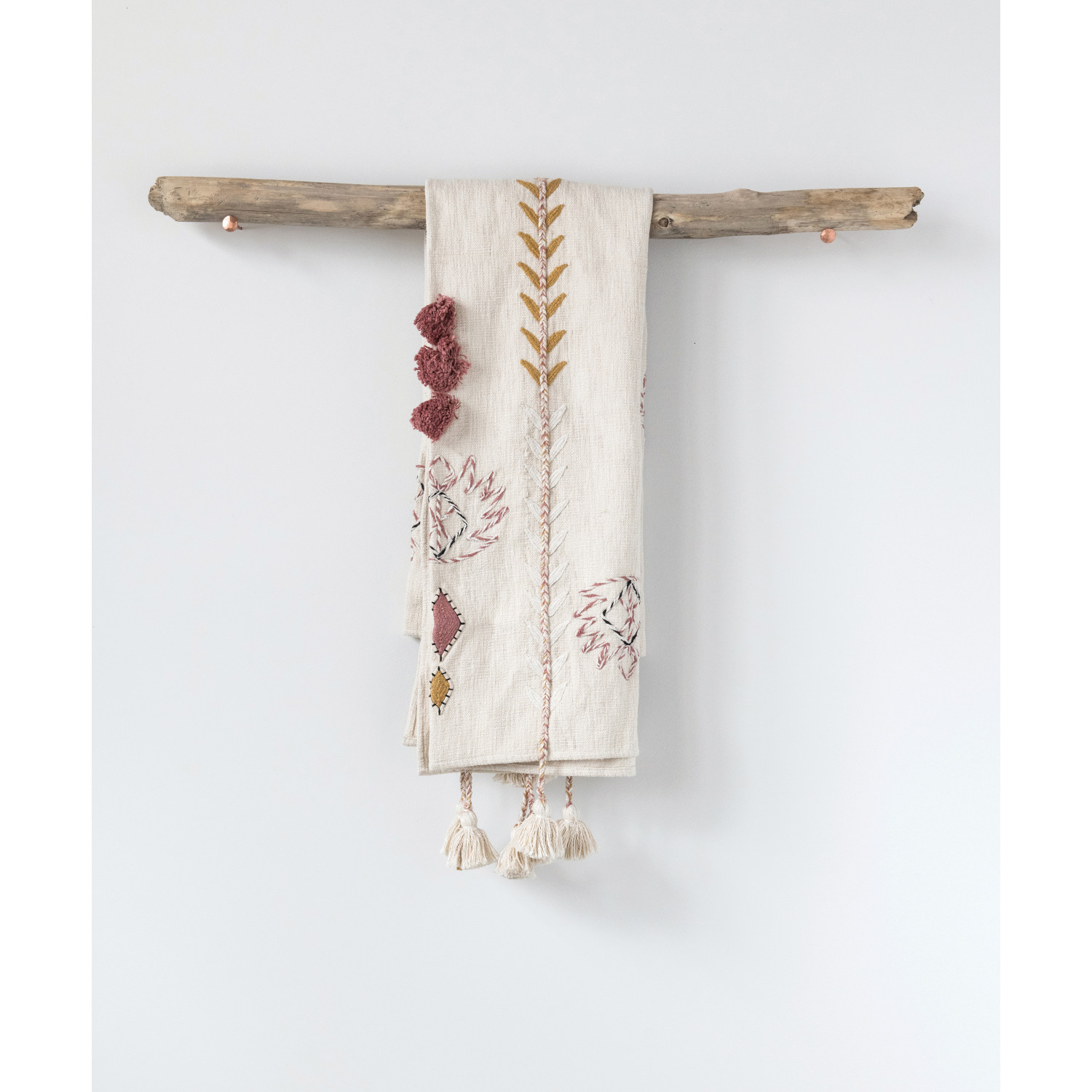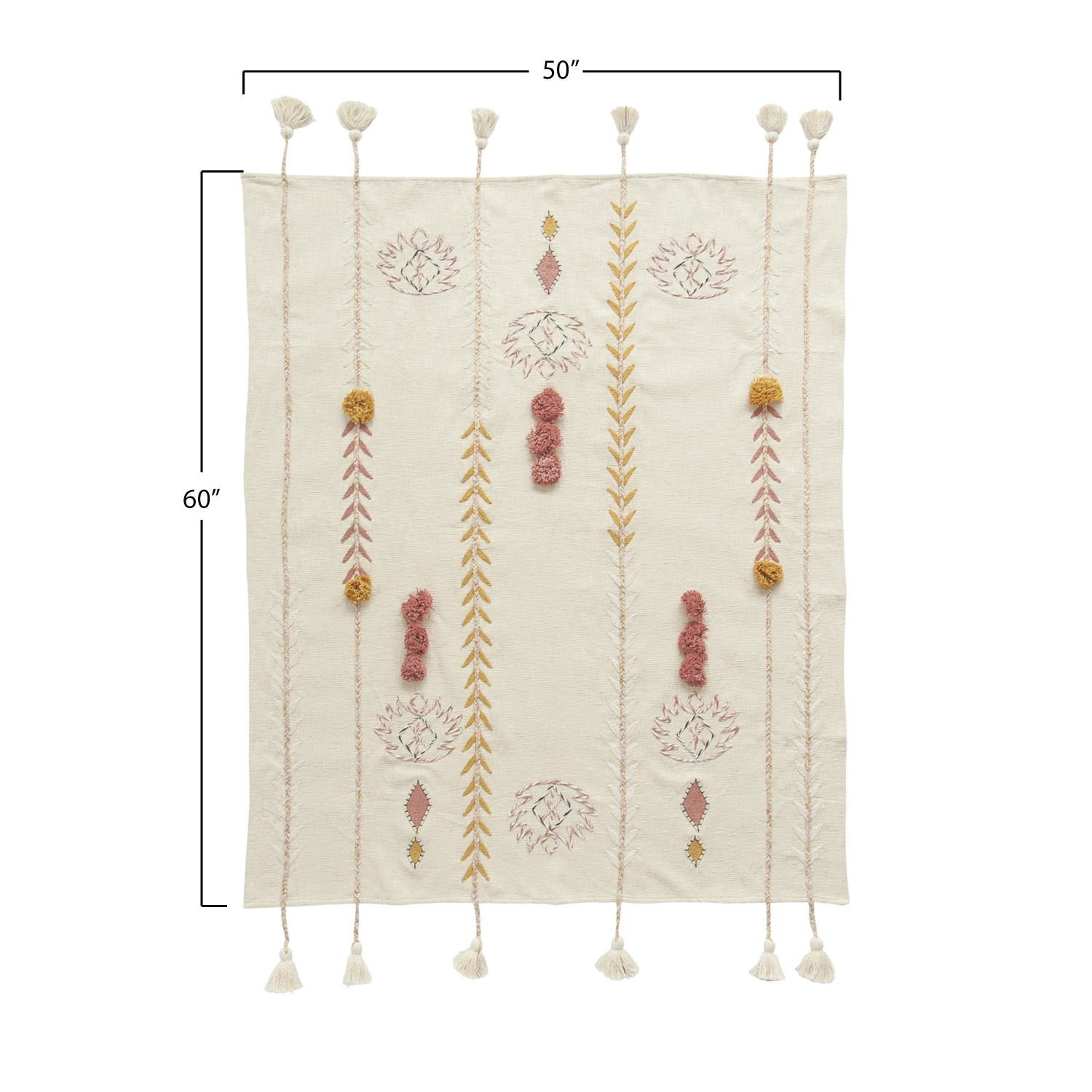 Catalog Name: 60"L x 50"W Cotton Embroidered Throw w/ Braided Tassels & Applique, Cream Color