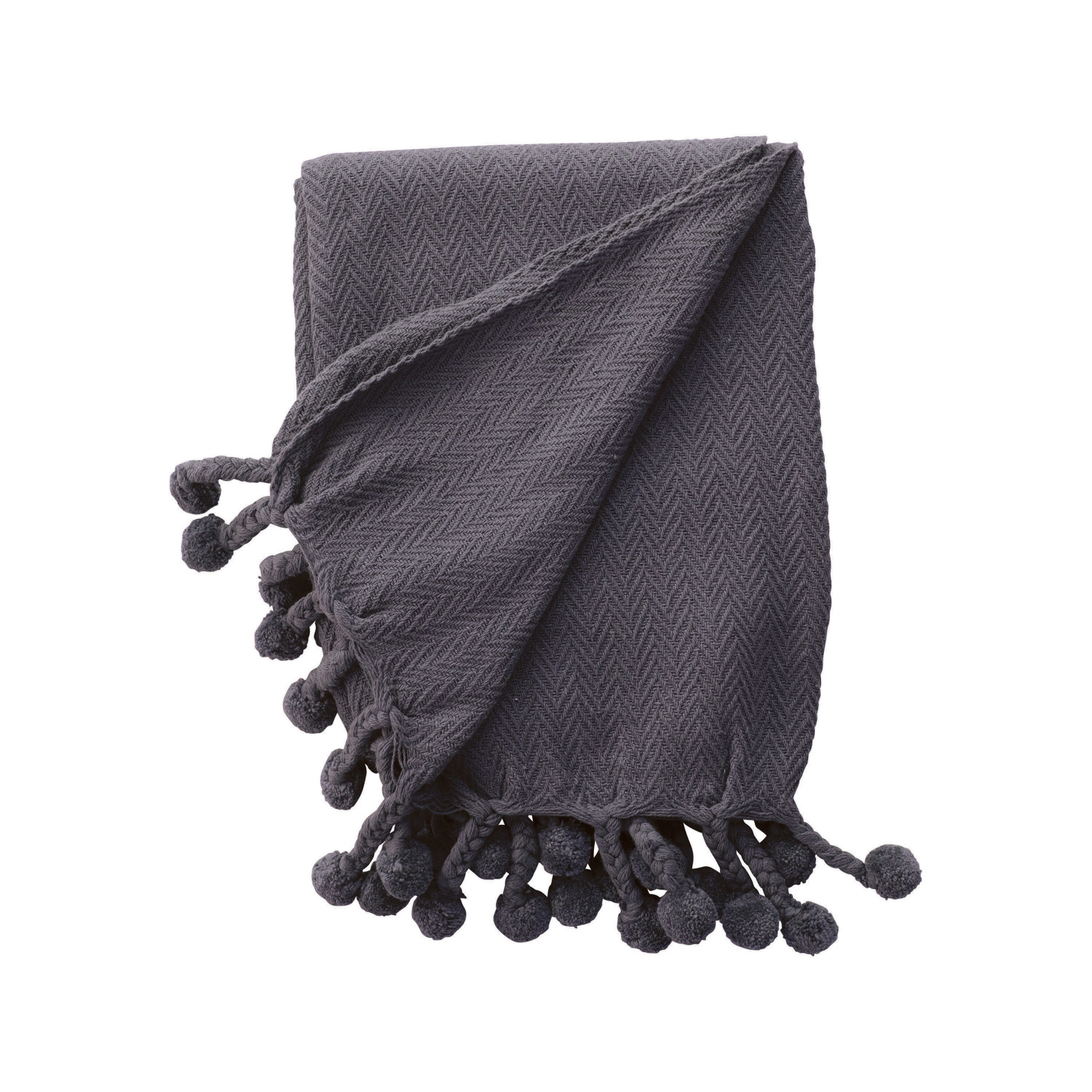 Catalog Name: 60"L x 50"W Woven Cotton Throw w/ Braided Pom Pom Tassels, Iron Color