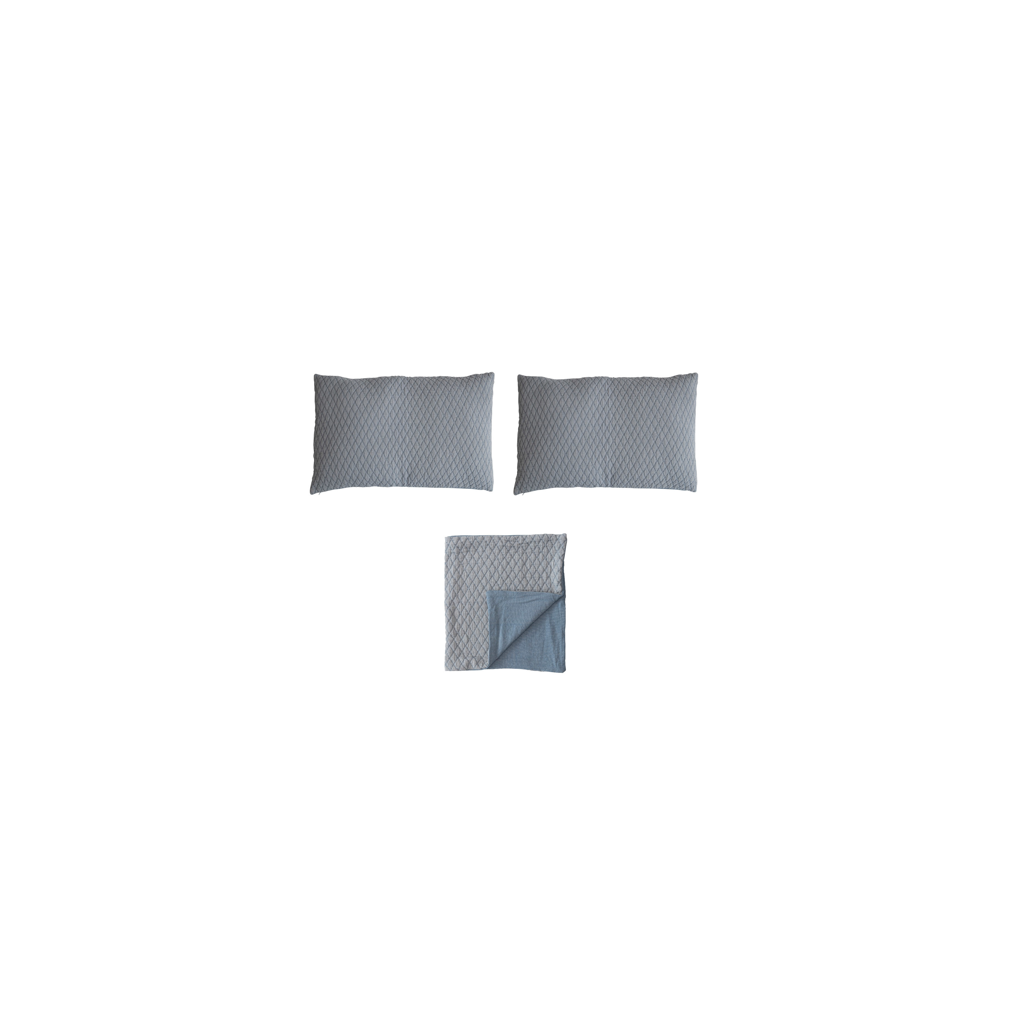 This serene cotton bedding set showcases supple woven cotton jacquard with a kantha stitch, and includes 2 quilted king shams and king-sized bed cover. Blue woven cotton jacquard king bedding set with quilted kantha stitch; Includes 2 king quilted shams and bed cover. Express your constantly evolving style with the simple addition of this eye-catching bedding set. King cotton jacquard bed set; Machine wash cold, gentle cycle, do not bleach, warm iron if needed.