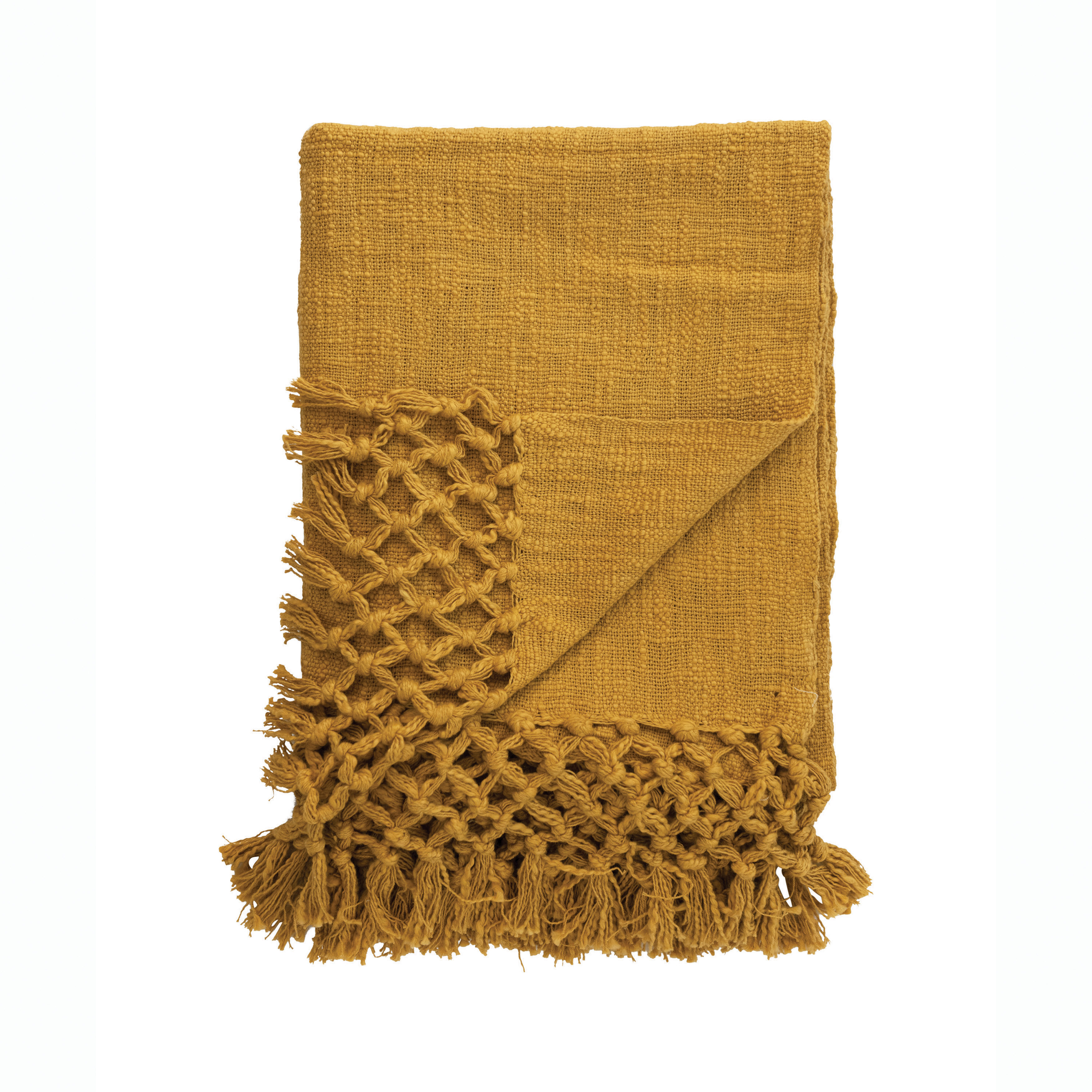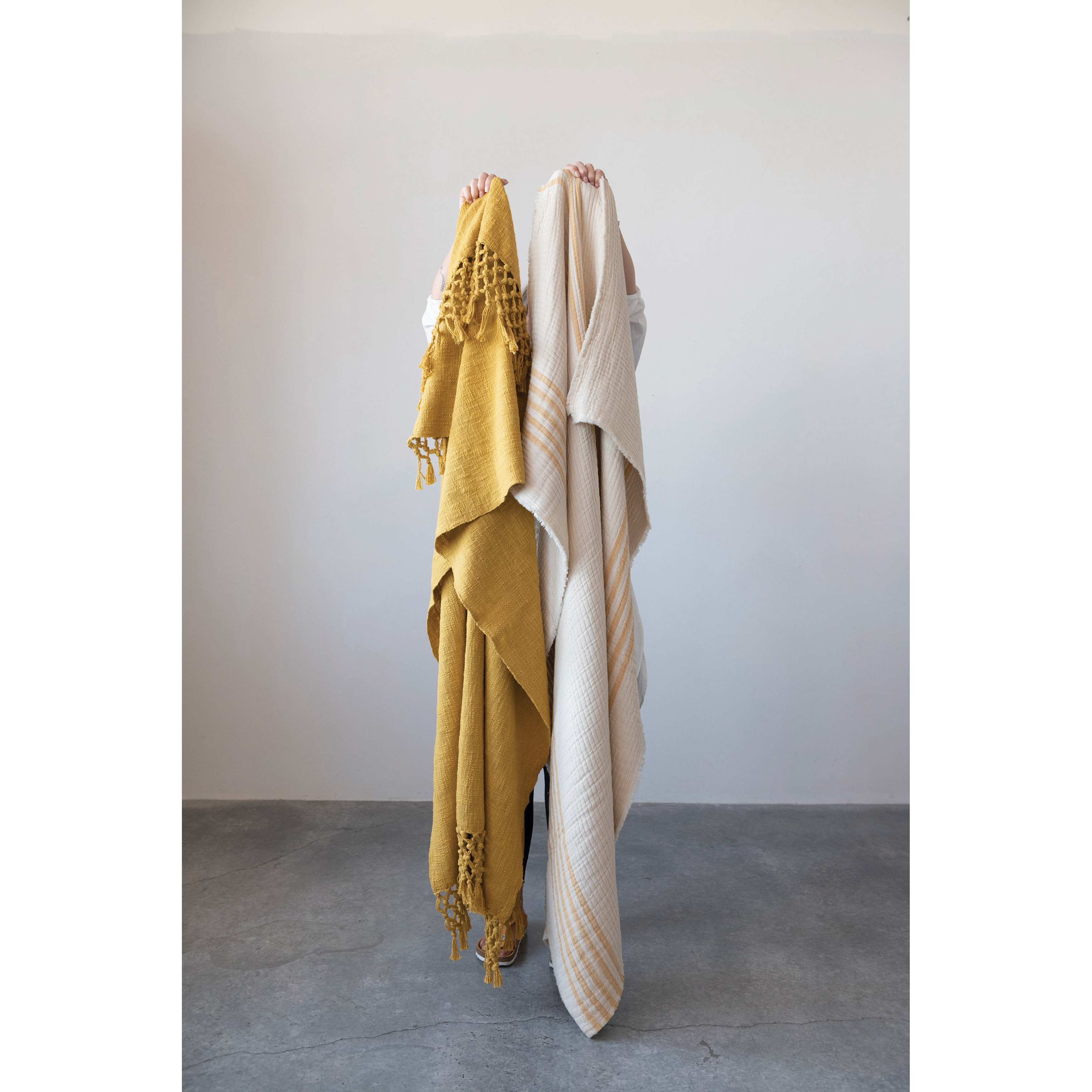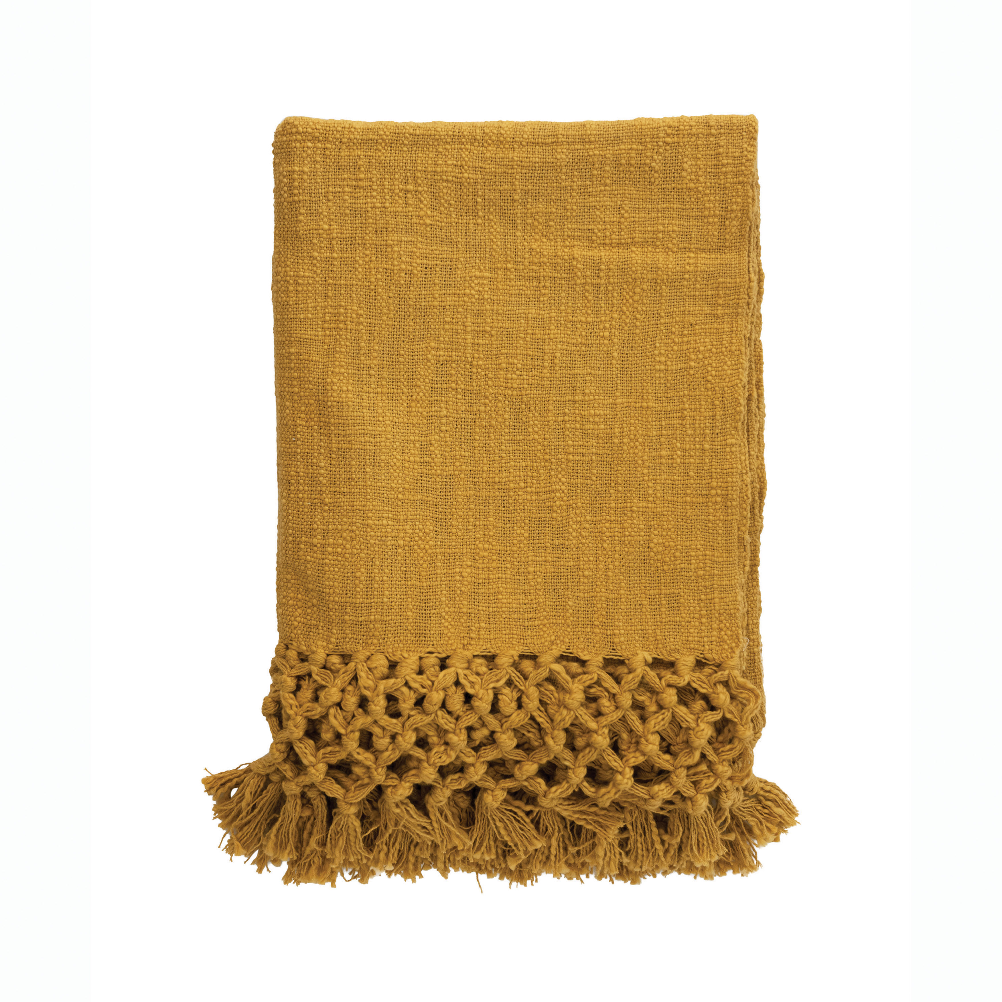 Catalog Name: 60"L x 50"W Woven Cotton Throw w/ Crochet & Fringe, Mustard Color