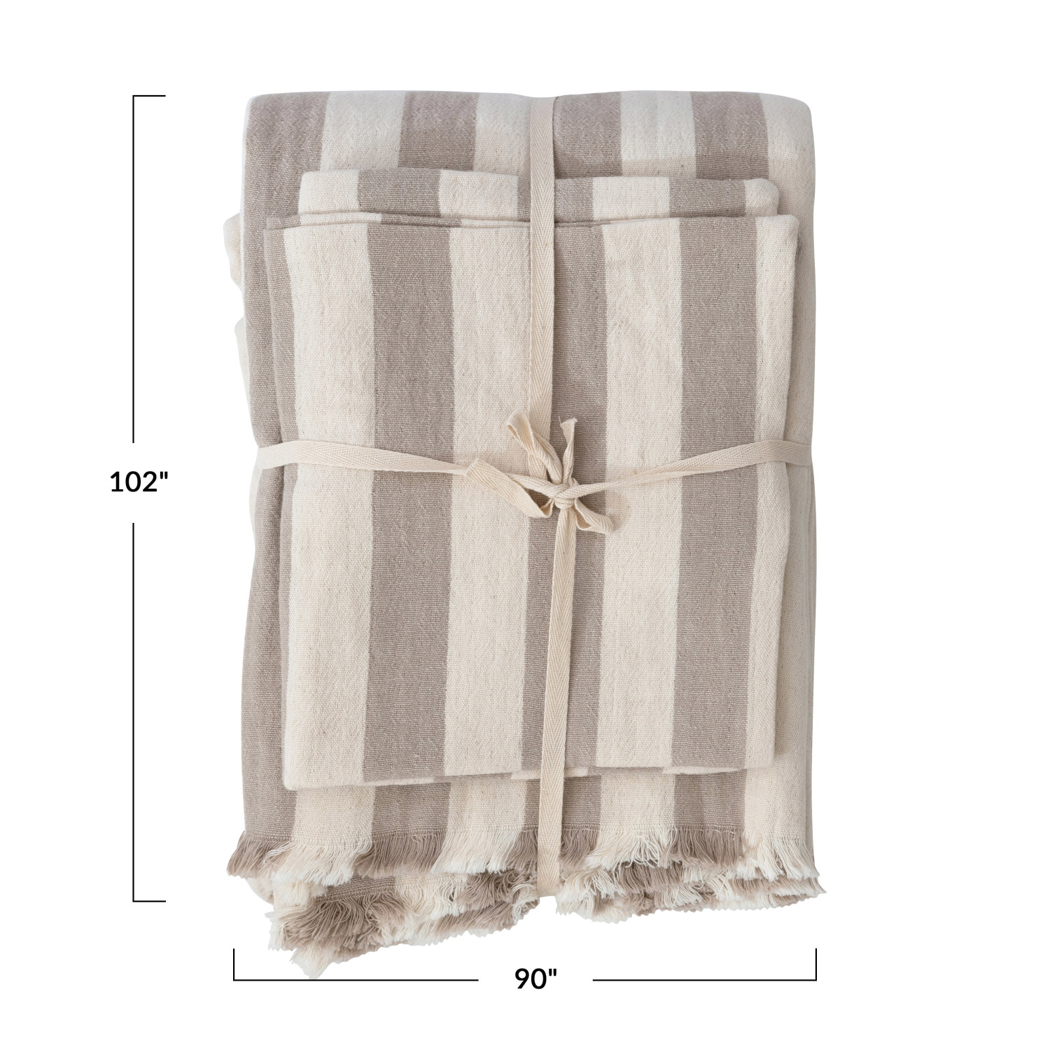 Catalog Name: 102"L x 90"W Cotton Double Cloth Bed Cover w/ Stripes & 2 Standard Shams w/ Wood Buttons, Queen, Cream & Tan Color, Set of 3 Tied w/ Cotton Tape