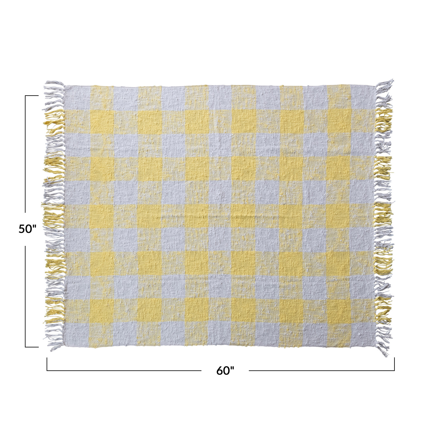 Catalog Name: 60"L x 50"W Hand-Woven Cotton Throw w/ Fringe, Yellow & Cream Color Plaid