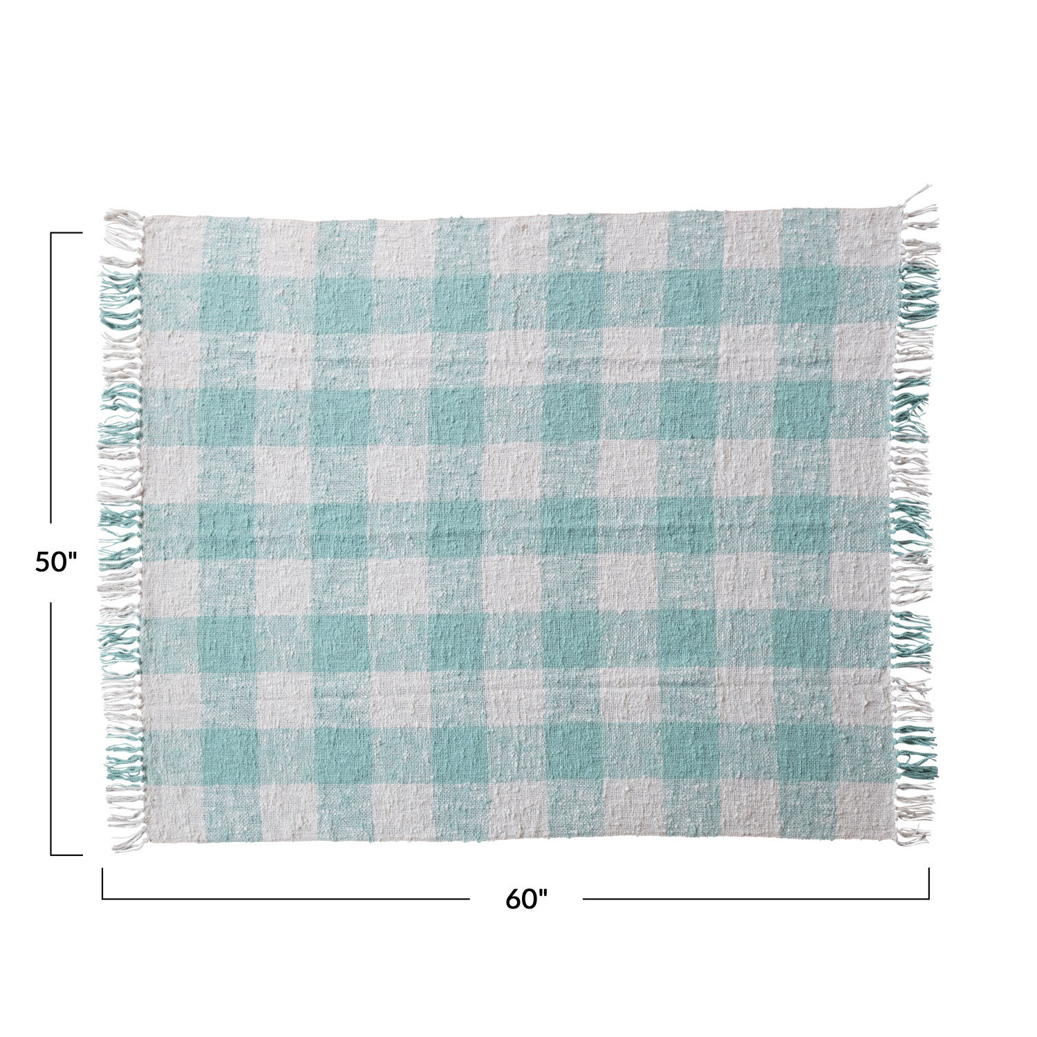 Add coziness and color to any space with this hand-woven cotton throw with plaid pattern and fringe. This cozy and classic throw blanket features a hand-woven cotton material that is soft and breathable. The cotton has a plaid pattern in mint and cream colors that adds contrast and flair to any space. The throw blanket has a fringed trim that gives it a unique and textured look. The throw blanket has a rectangular shape that measures 60 inches long and 50 inches wide, making it a generous size for any space. This hand-woven cotton throw with plaid pattern and fringe is a versatile accessory that can match any farmhouse, traditional, cabin, beach, or coastal style home. It can be used as a sofa cover, a bedspread, a picnic blanket, or a wrap. It can also be machine washed and dried for easy care. It can be used to add coziness and color to any space with its cozy design and quality material.