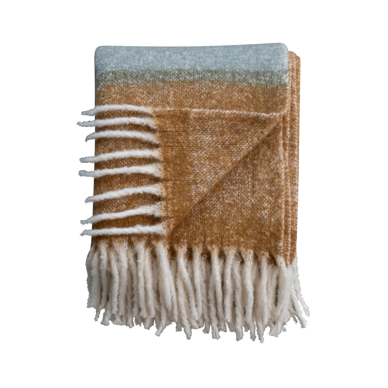 Add some color and comfort to the home with this stylish multi-colored striped throw blanket. This lovely blanket has a dark brown striped design in various hues and a fringe trim that adds texture and style. The blanket is made from a soft and cozy blend of brushed acrylic and New Zealand wool, which is durable and easy to maintain. Use this blanket to curl up on the sofa, layer it on the bed, or toss it over a chair or a bench for a pop of color. This blanket is suitable for different types of decor, such as farmhouse, cottagecore, boho, or lodge. It has a generous size of 60 inches by 50 inches, enjoy it in any season and occasion. This striped acrylic and wool throw blanket is a wonderful way to enhance the living space with warmth and charm.