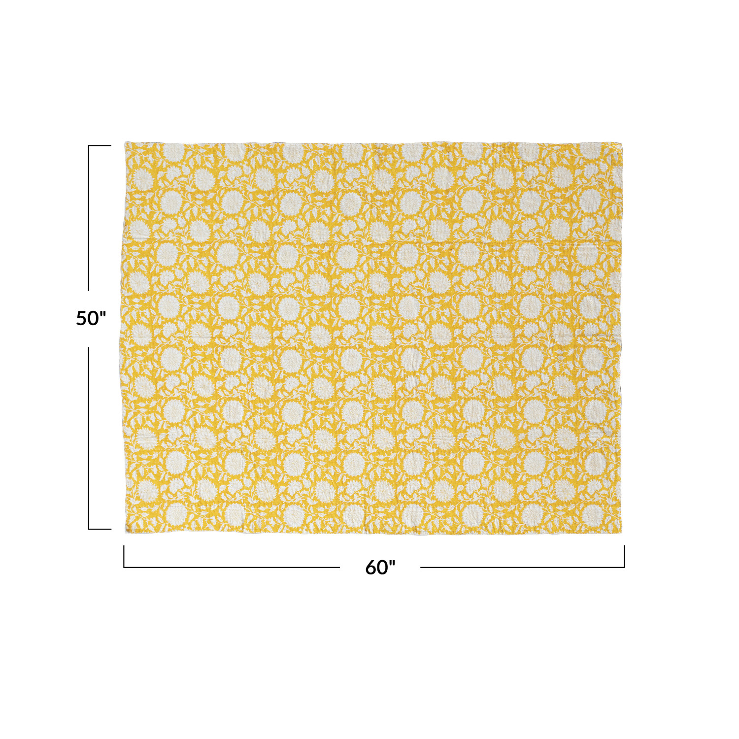Catalog Name: 60"L x 50"W Cotton & Linen Voile Block Printed Throw w/ Floral Pattern & Hand-Embroidered Kantha Stitch, Yellow & Natural
