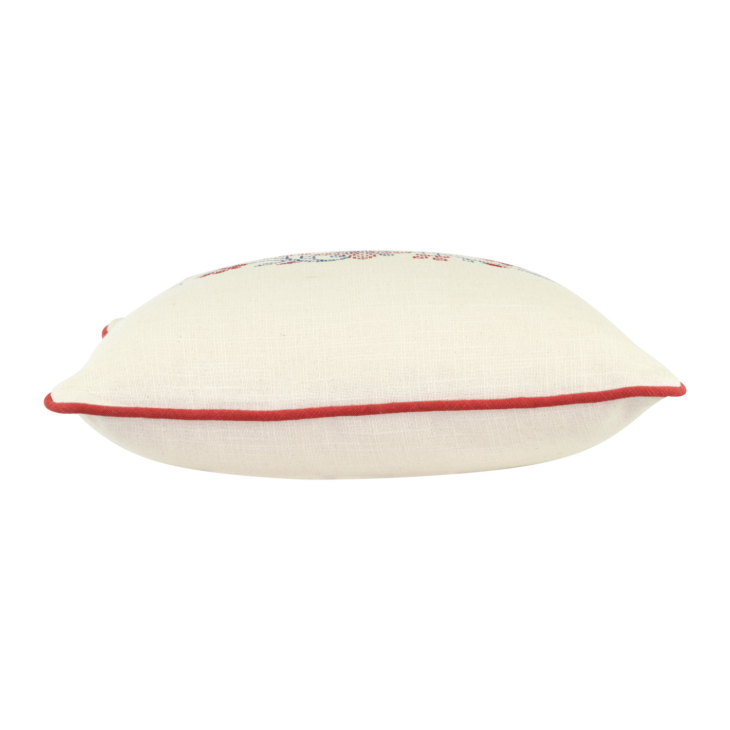 Red trim decorates the edges of this red, white and blue floral pillow. Pair it with other blue or red pillows and add a beautiful red throw behind them. Next add red pillar candles to the room decor for a complete and cohesive space.