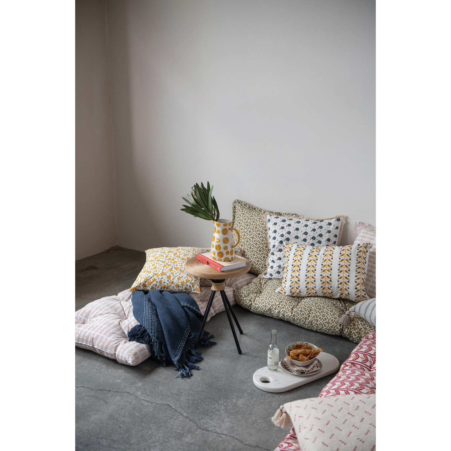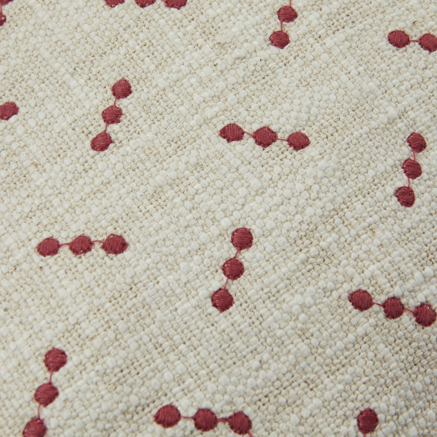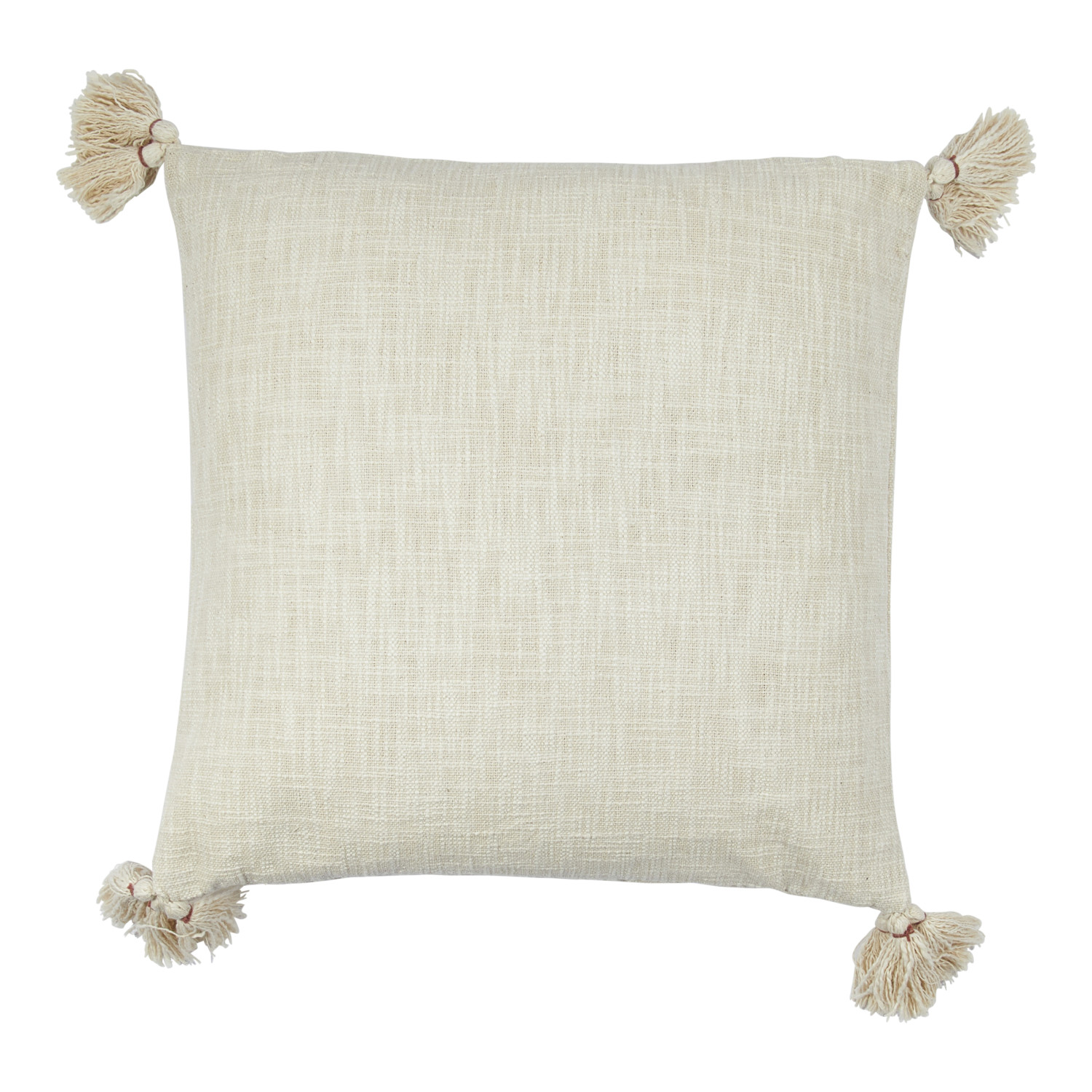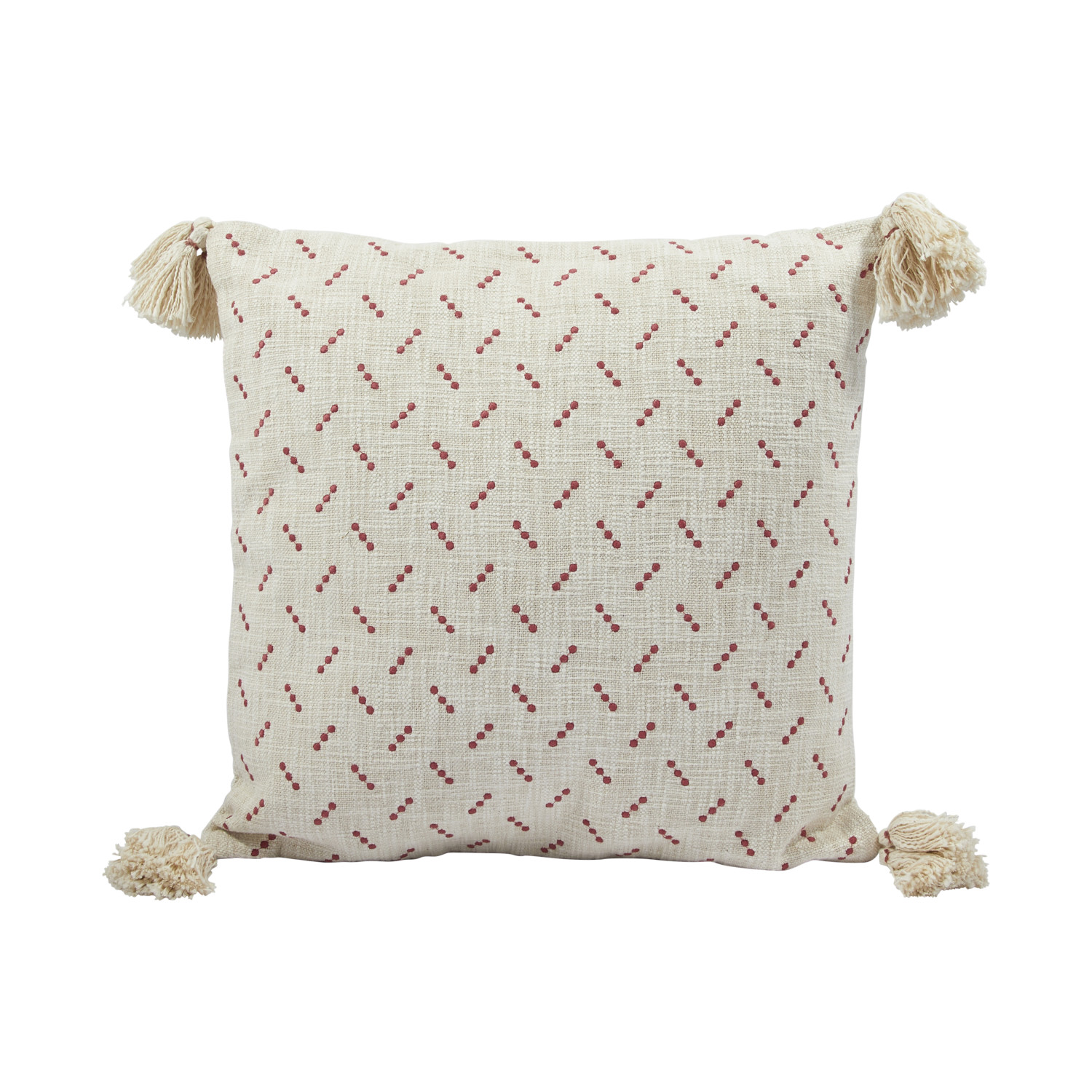 Cream and Red cotton slub pillow with embroidered dots and tassels; Cover: 100% Cotton Slub, Filling: 100% Polyester; 20"L x 20"W x 2"H. Prop 65 Compliant. Machine Wash Cold With Mesh Bag.