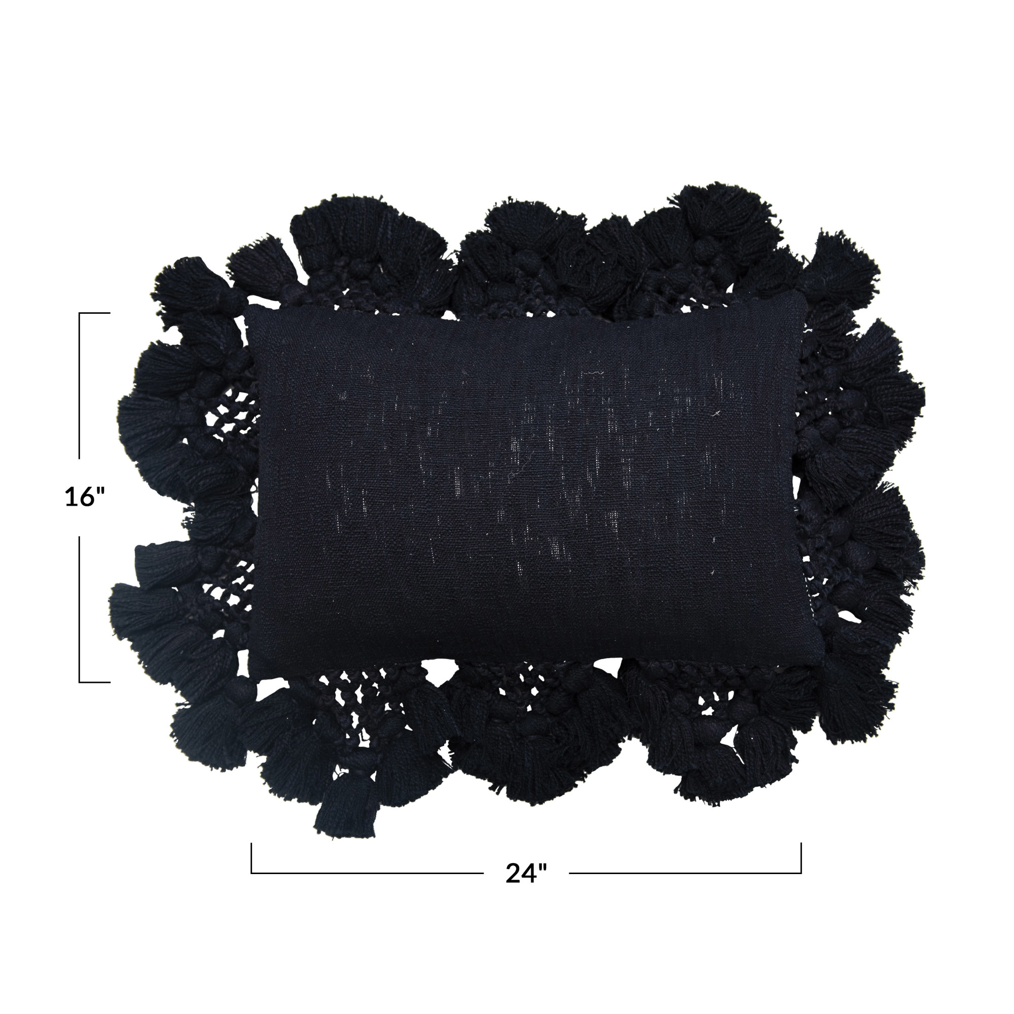 Black cotton slub lumbar pillow with crochet and tassels; Cover: 100% Cotton, Filling: 100% Polyester; 24"L x 16"W x 2"H. Prop 65 Compliant. Machine Wash Cold With Mesh Bag.