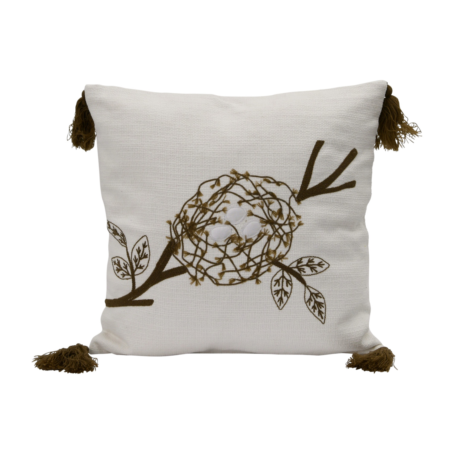 Catalog Name: 18" Square Cotton Embroidered Pillow w/ Nest & Tassels, Brown & Cream Color