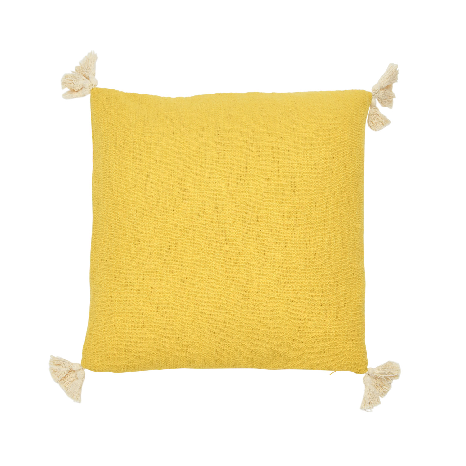 This subtly playful throw pillow cover showcases soft cotton slub, intricately embroidered with dots, and finished with decorative tassels. Square yellow and cream cotton throw pillow with embroidered dots and tassels; Cotton slub encasement on back. Express your constantly evolving style with the simple addition of this eye-catching pillow. Removable cotton throw pillow cover with polyester insert; Hidden in seam zipper closure; Machine wash cold with mesh bag, gentle cycle, do not bleach, warm iron if needed.