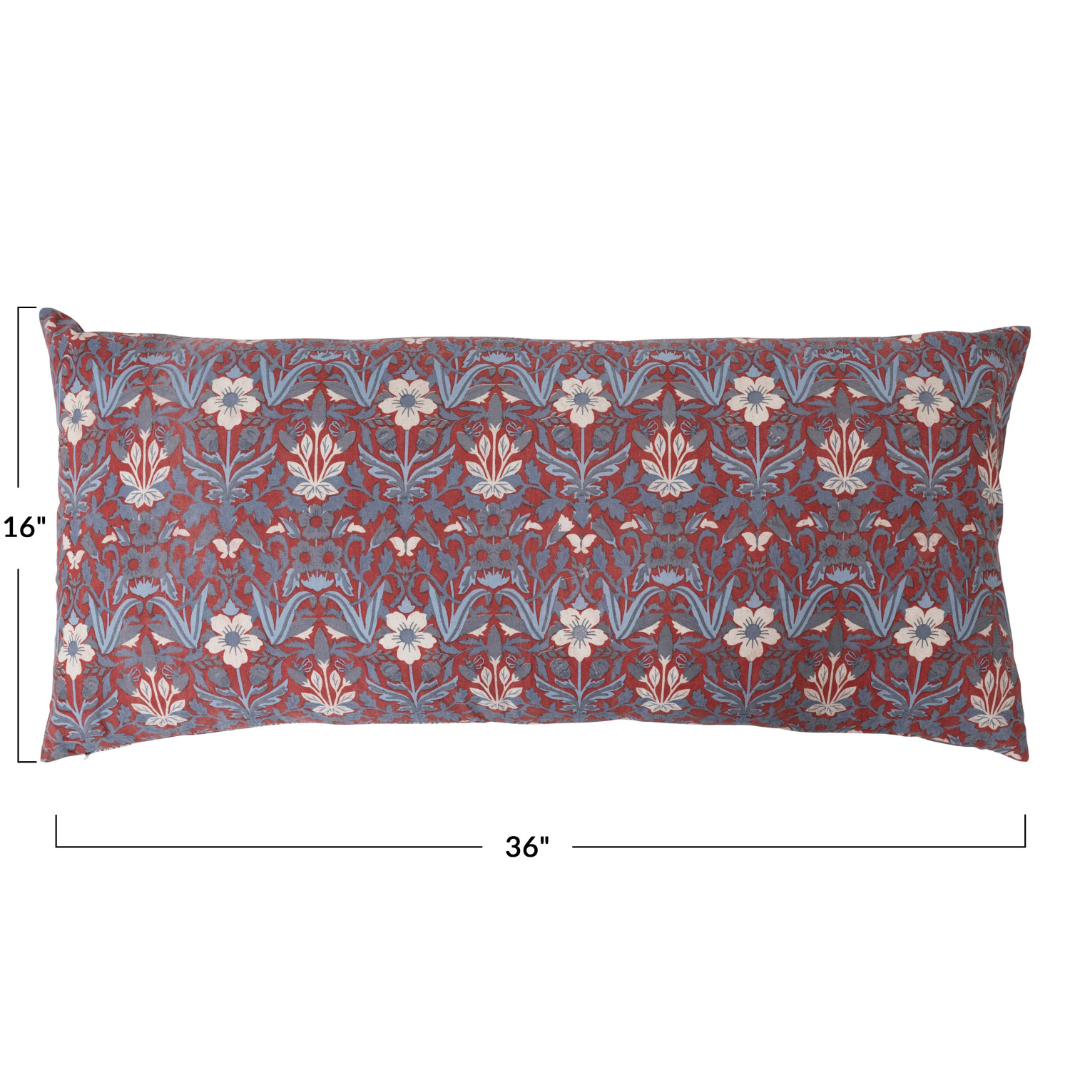 Catalog Name: 36"L x 12"H Cotton Lumbar Pillow w/ Floral Pattern, Red, Blue & White ©