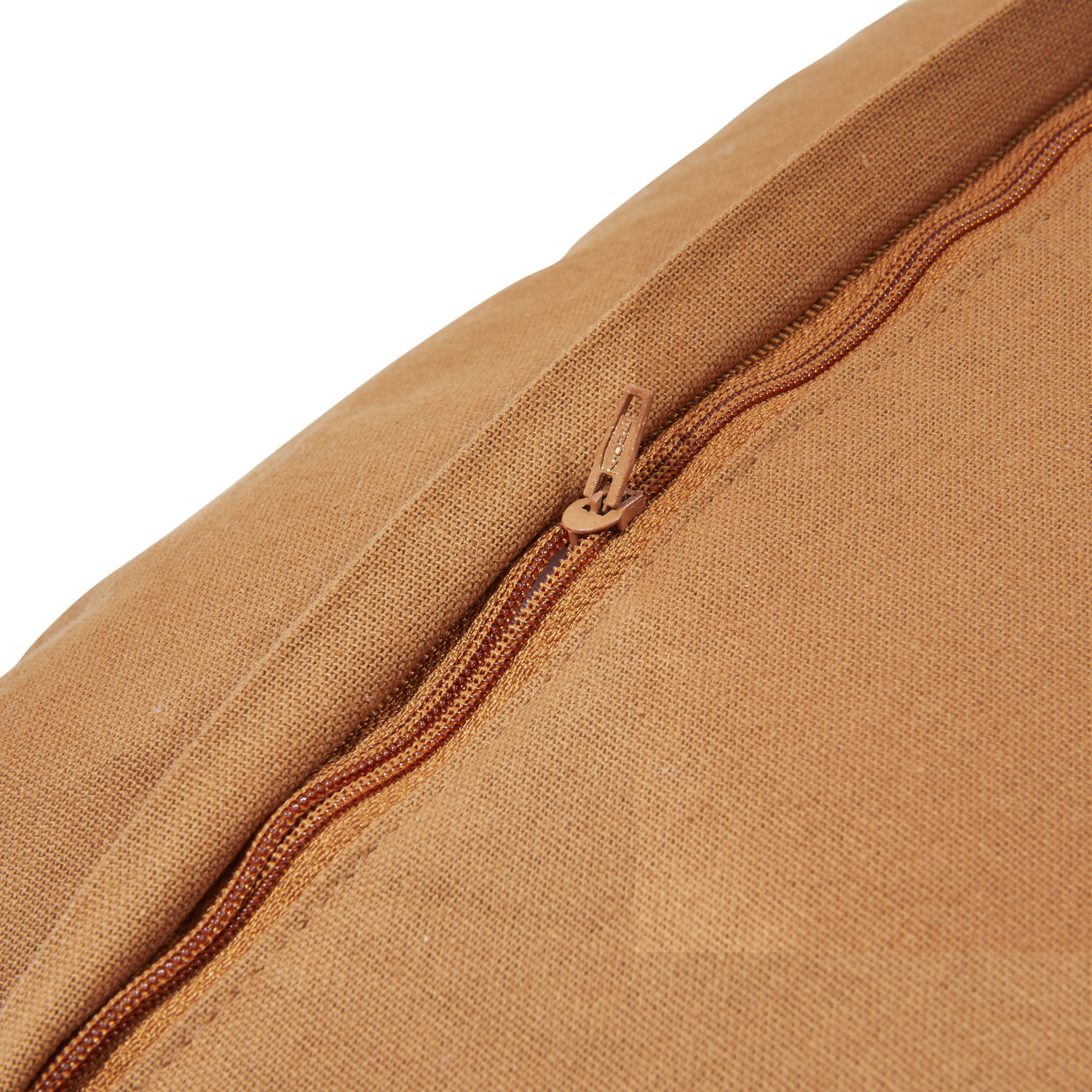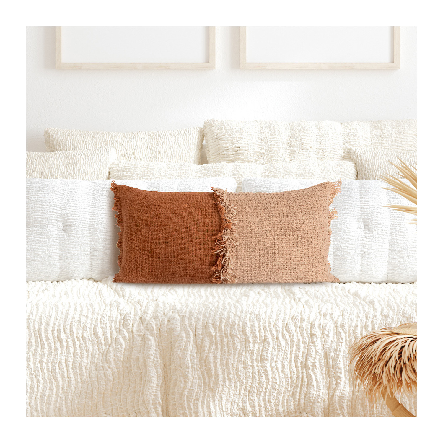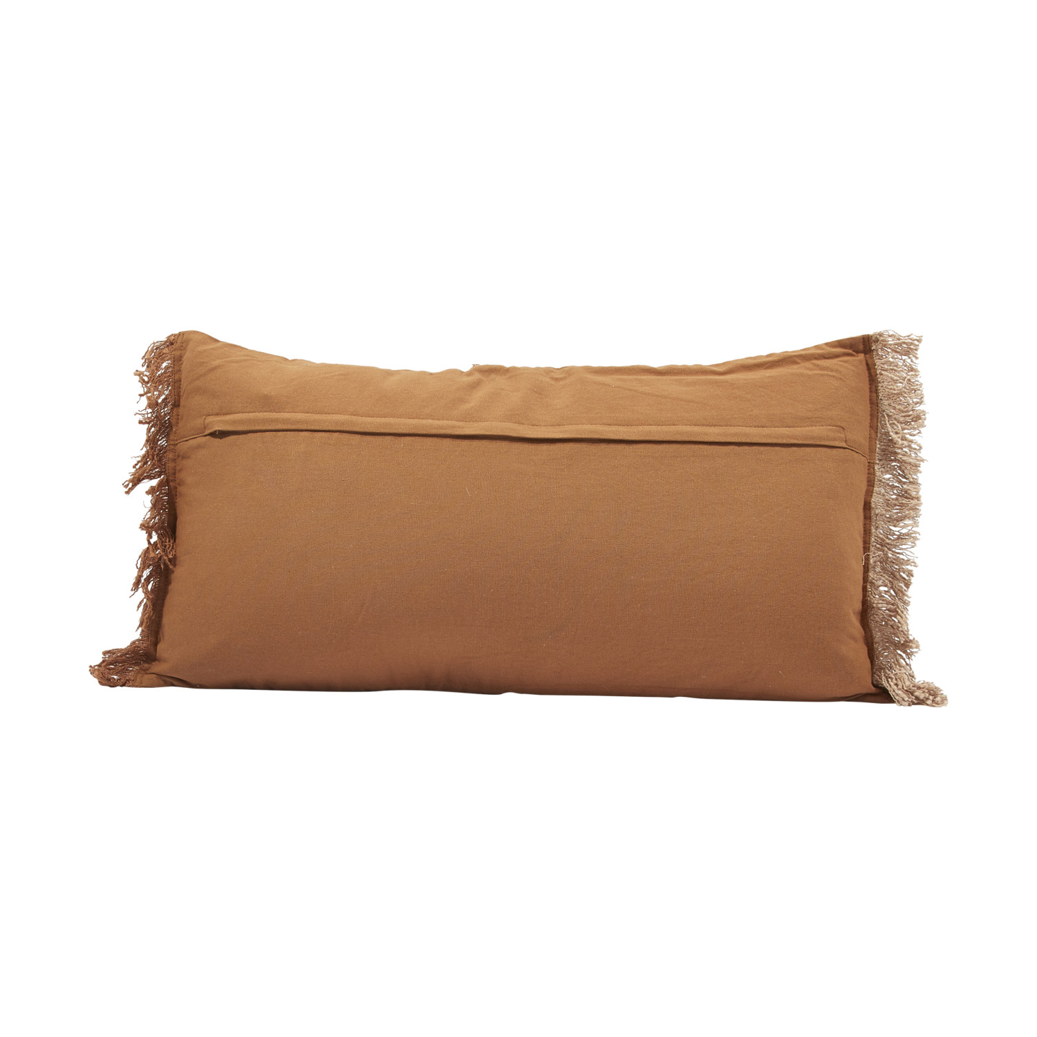 This rustically contemporary lumbar pillow features contrasting tones of durable woven cotton, finished with delicate fringe. Pink and rust woven cotton throw pillow with fringe; Rust cotton encasement on back. Express your constantly evolving style with the simple addition of this eye-catching pillow. Removable cotton pillow cover and insert; Back zipper with hidden flap; Machine wash cold, gentle cycle, tumble dry low, do not bleach, warm iron.