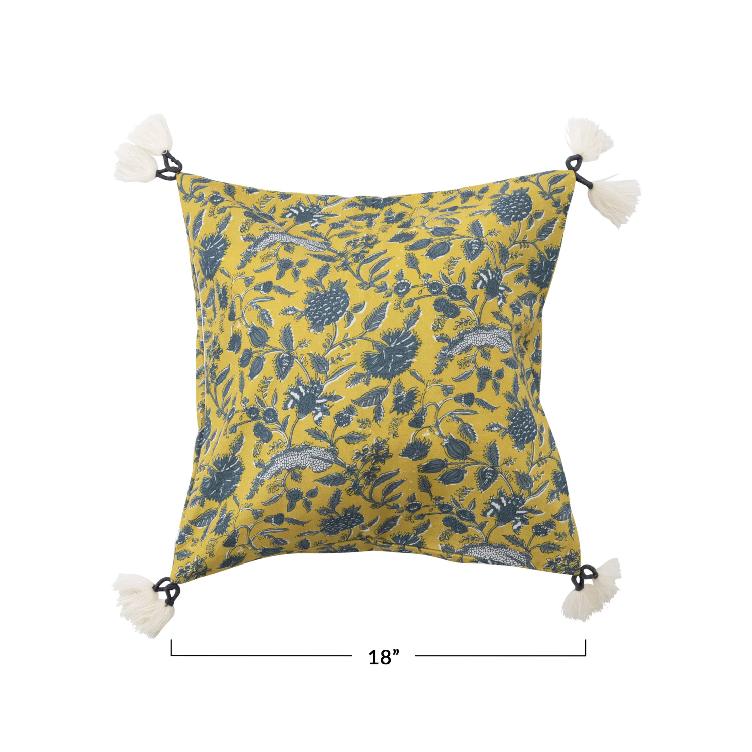 Catalog Name: 18" Square Cotton Pillow w/ Floral Pattern & Yarn-Wrapped Tassels, Blue, Chartreuse & White
