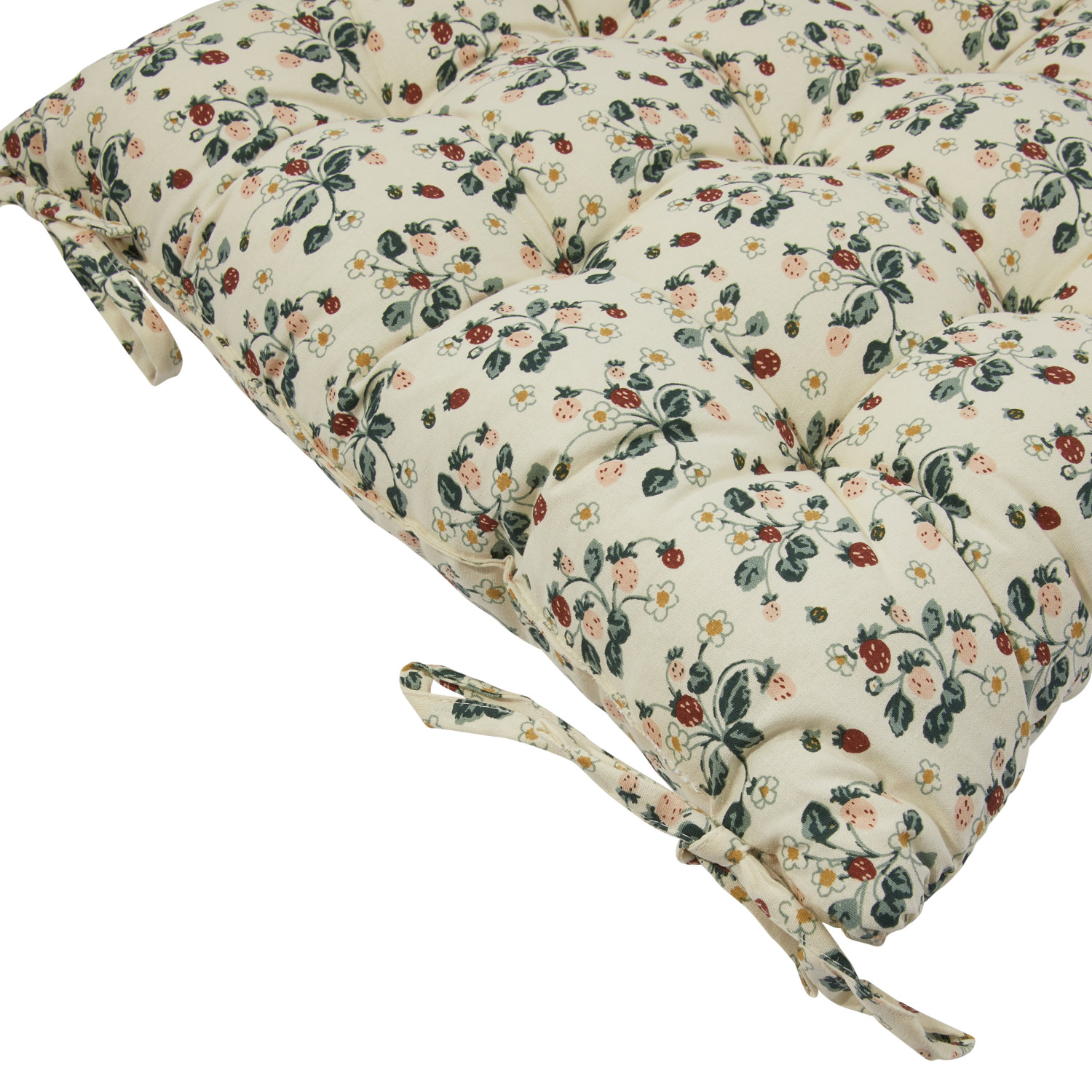 This eclectic chair cushion features quilted cotton construction in a whimsical strawberry print, finished with stylishly functional ties. Square multicolor quilted cotton chair cushion with strawberry pattern. Express your constantly evolving style with the simple addition of this eye-catching chair cushion. Machine wash or hand wash.