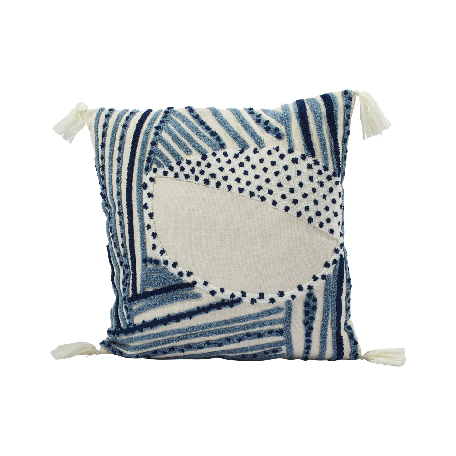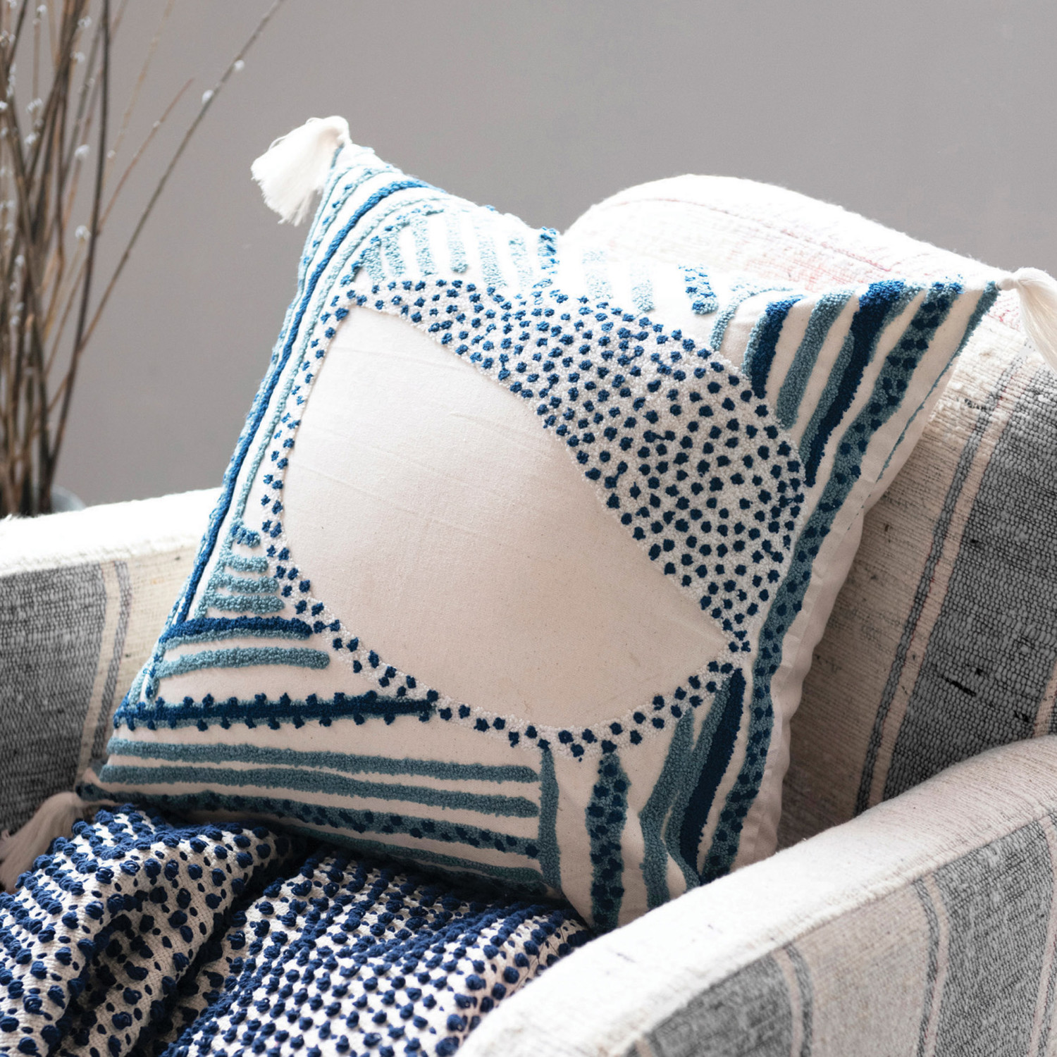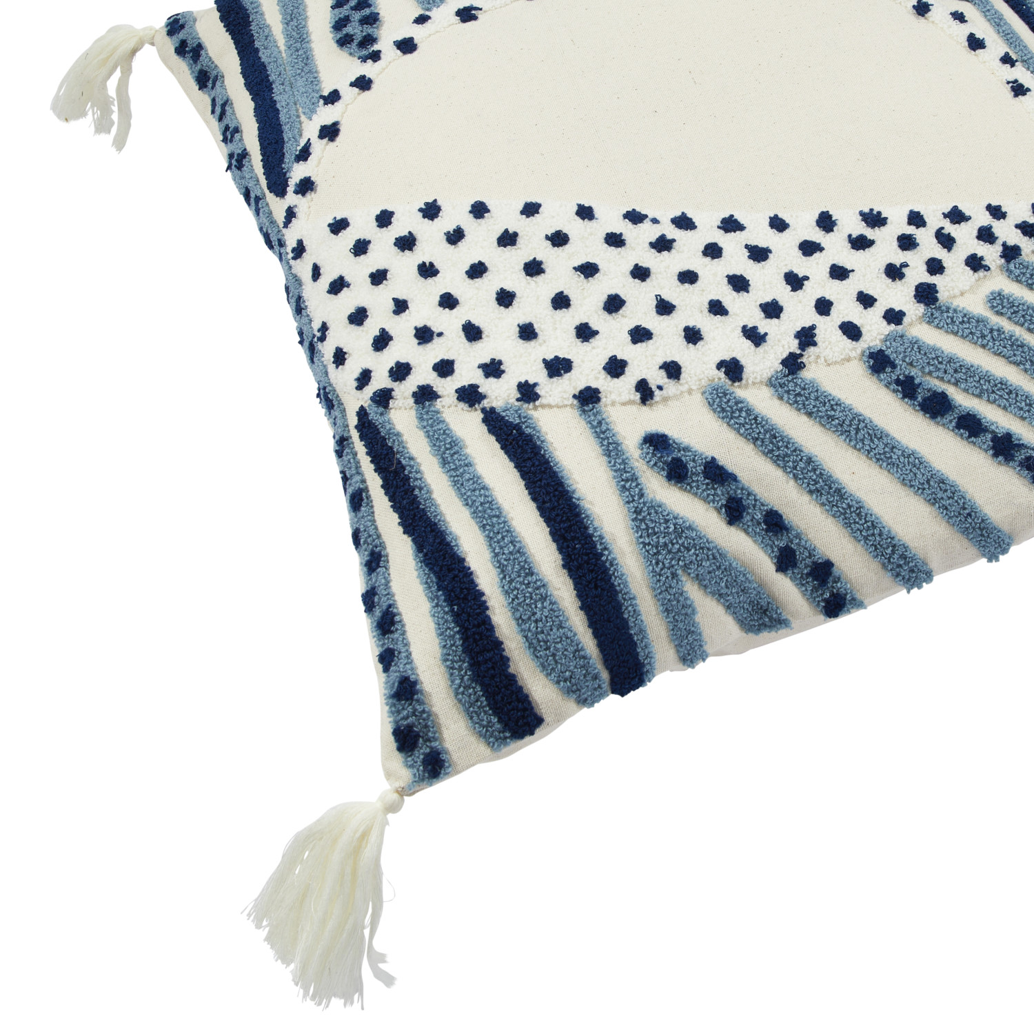 This modern throw pillow cover features an abstract, nature-inspired design intricately embroidered on woven cotton, finished with decorative tassels. Square blue and white cotton throw pillow with embroidered pattern and tassels; White cotton encasement on back. Express your constantly evolving style with the simple addition of this eye-catching pillow. Removable cotton throw pillow cover with polyester insert; Hidden in seam zipper closure; Machine wash with mesh bag or hand wash.