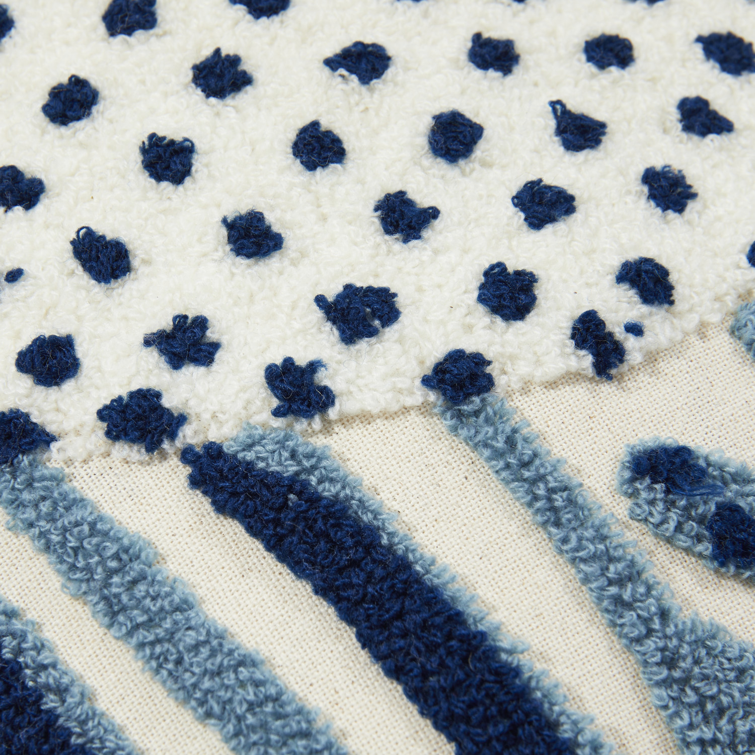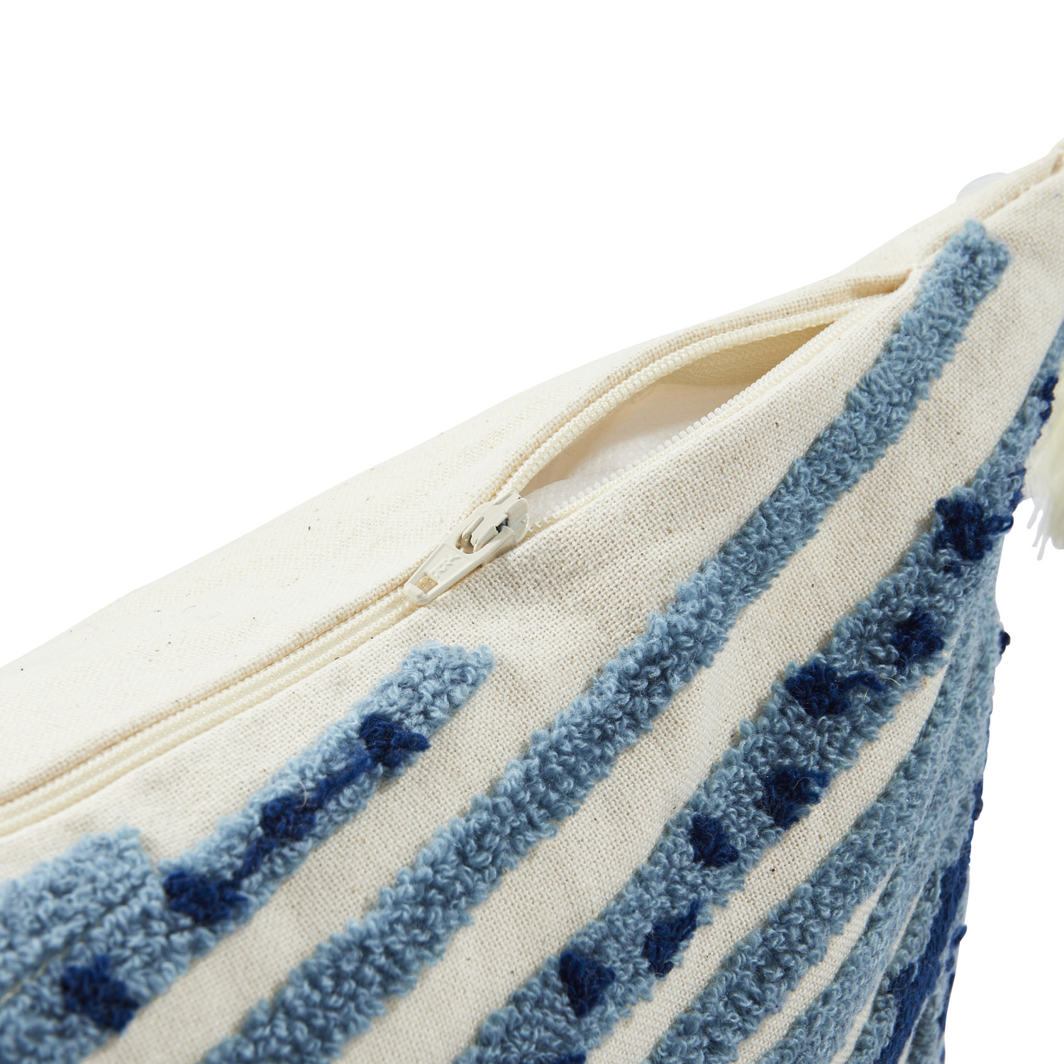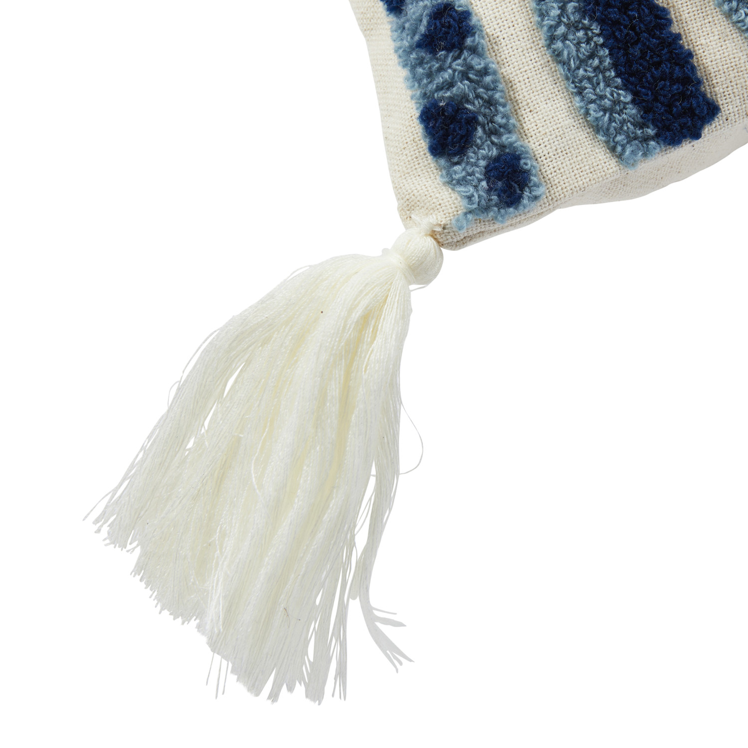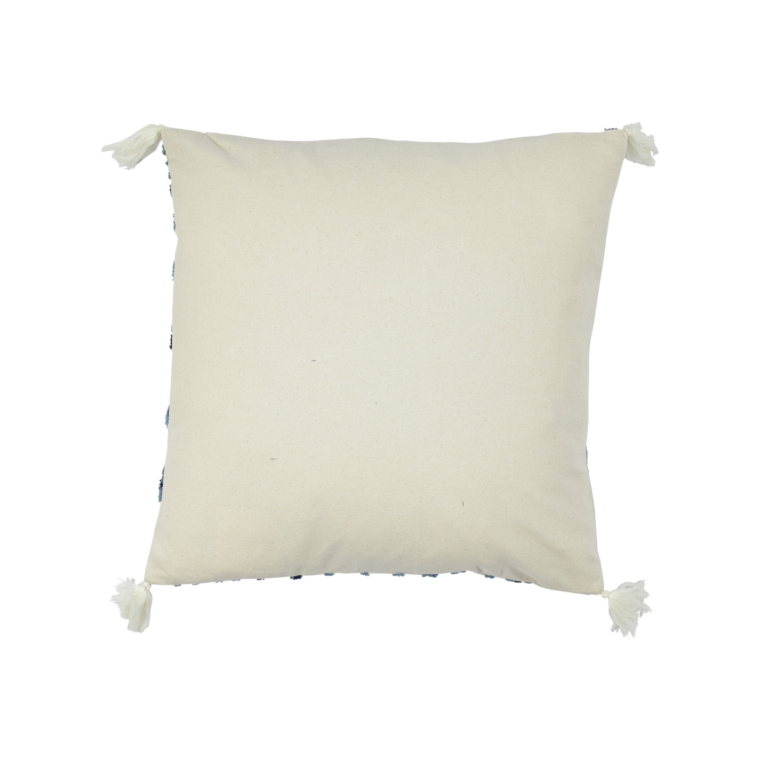 This modern throw pillow cover features an abstract, nature-inspired design intricately embroidered on woven cotton, finished with decorative tassels. Square blue and white cotton throw pillow with embroidered pattern and tassels; White cotton encasement on back. Express your constantly evolving style with the simple addition of this eye-catching pillow. Removable cotton throw pillow cover with polyester insert; Hidden in seam zipper closure; Machine wash with mesh bag or hand wash.