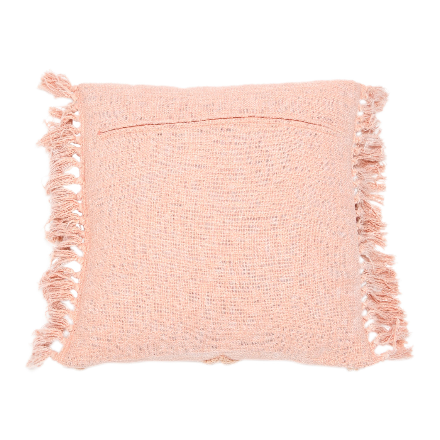This modern boho throw pillow cover features a geometric tufted pattern on a cotton blend adorned with playful fringe. Square cotton blend throw pillow with tufted geometric design and fringe in pink; Pink cotton encasement on back. Express your constantly evolving style with the simple addition of this eye-catching pillow. Removable cotton pillow cover with polyester insert; Back zipper with hidden flap; Hand wash, warm iron if needed.