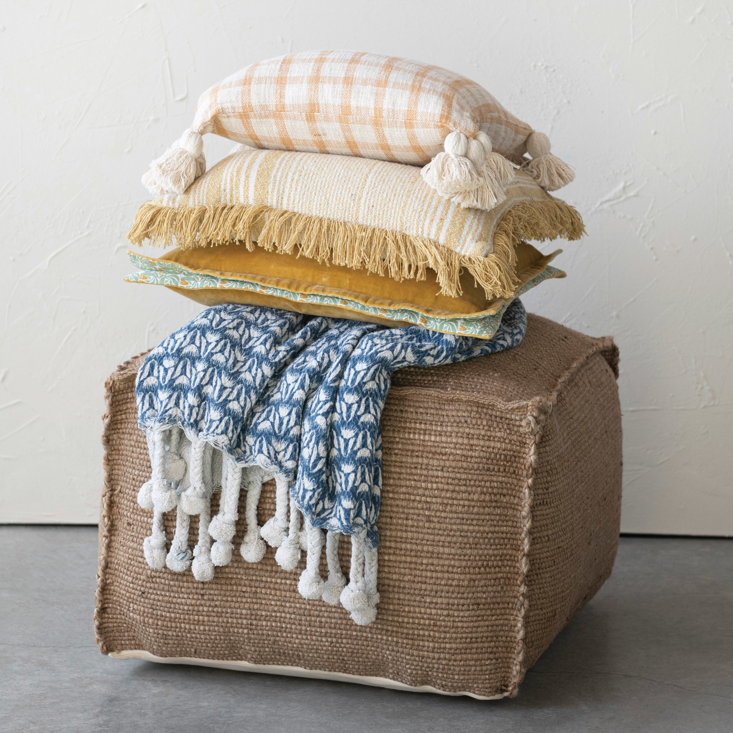 Mustard cotton velvet pillow with patterned flanged edge. Machine Wash Cold. Prop 65 Compliant.