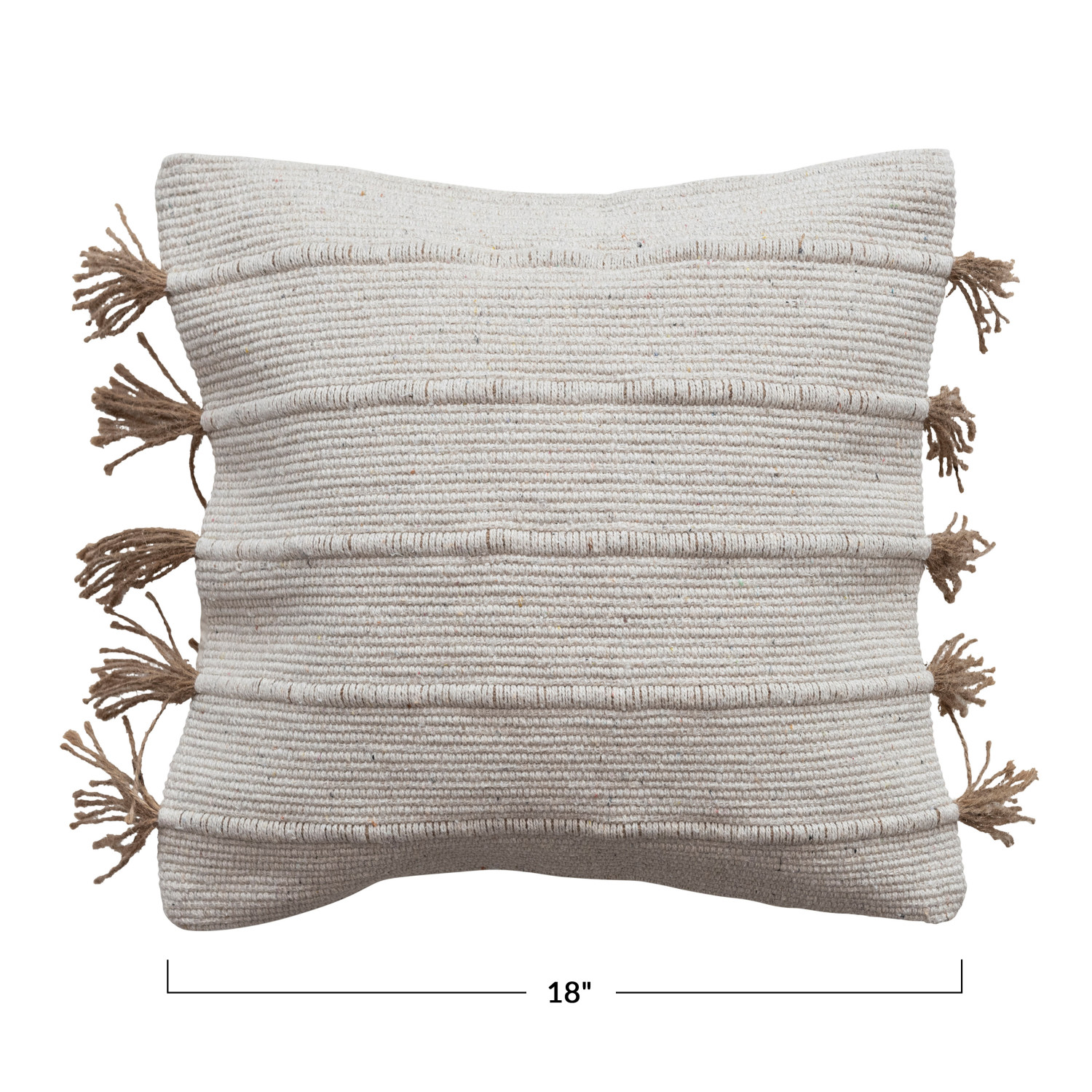 This woven jute and cotton dhurrie pillow with tassels is the perfect way to add a natural texture and style to the home. The soft yet durable fabric is ideal for everyday use, and the tassels add a playful touch. The pillow features a back opening for easy insert removal and is machine-washable for easy care. It is also perfect for any room in the home, from the living room to the bedroom. Use it as a throw pillow on the couch, bed, or floor pillow to create a cozy seating area. It is also an excellent gift for any occasion. The cushion measures 18 inches long and 18 inches high. Whether used as a lumbar support on the couch or as a decorative accent on the bed, this quality pillow will make the home more beautiful and cozy. A cozy and rustic square pillow with a woven jute and cotton dhurrie cover, featuring cream and brown stripes and tassels on each corner. With back opening; add some texture and warmth to the sofa, bed, or chair. Polyester fill insert included. The pillow cover is made from cotton and jute; the insert is made from polyester.