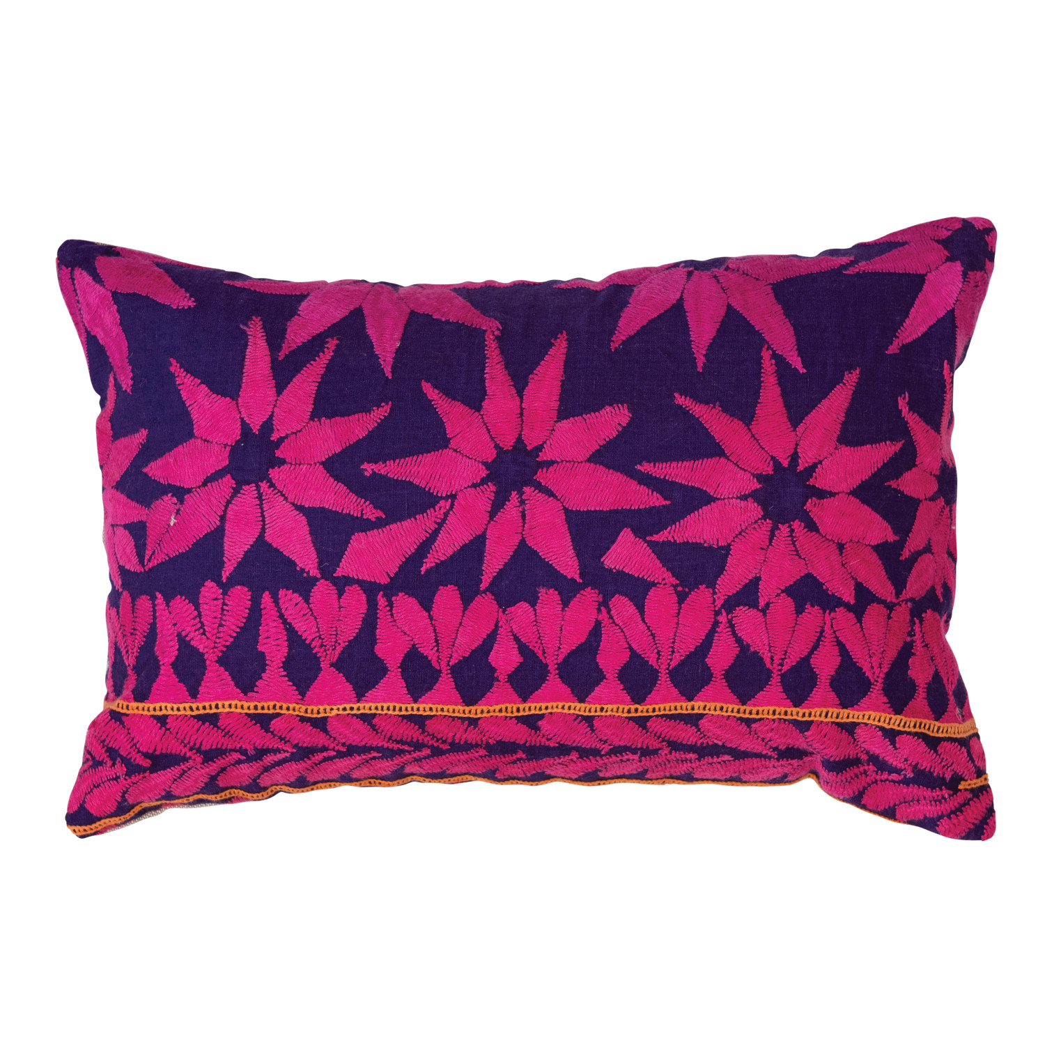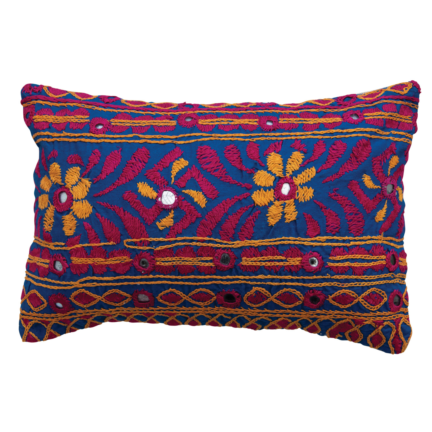 Catalog Name: 14"L x 9"H Found Cotton Lumbar Pillow w/ Embroidered Design & Chambray Back, Multi Color (Each One Will Vary)